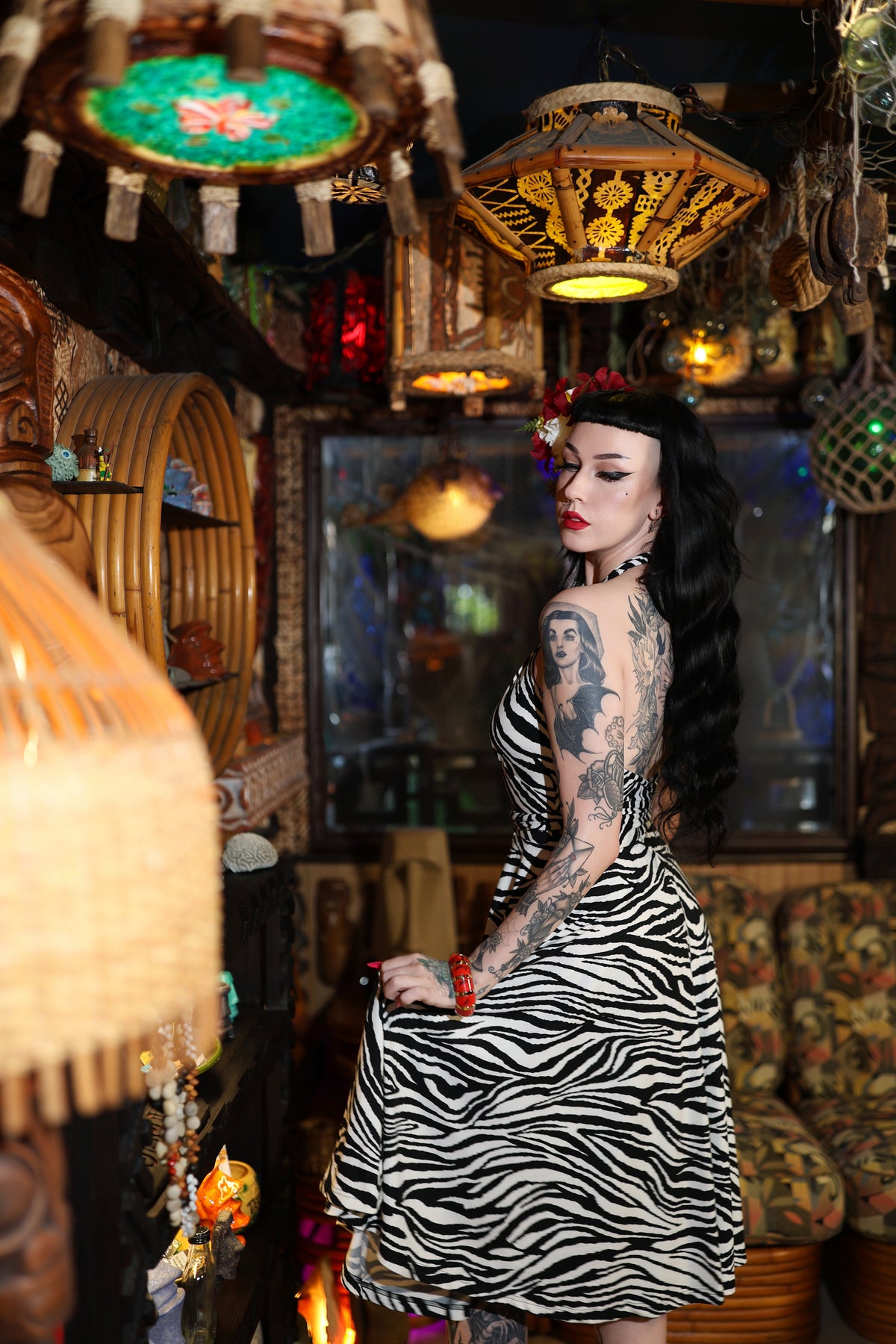 A tattooed woman with long black hair and red lipstick wears the ElleRebel Orleans Swing Dress in Zebra PREORDER as she sits on a vintage-patterned sofa in a tiki-themed room, surrounded by colorful mugs, vintage decor, bar coasters, and matchbooks.