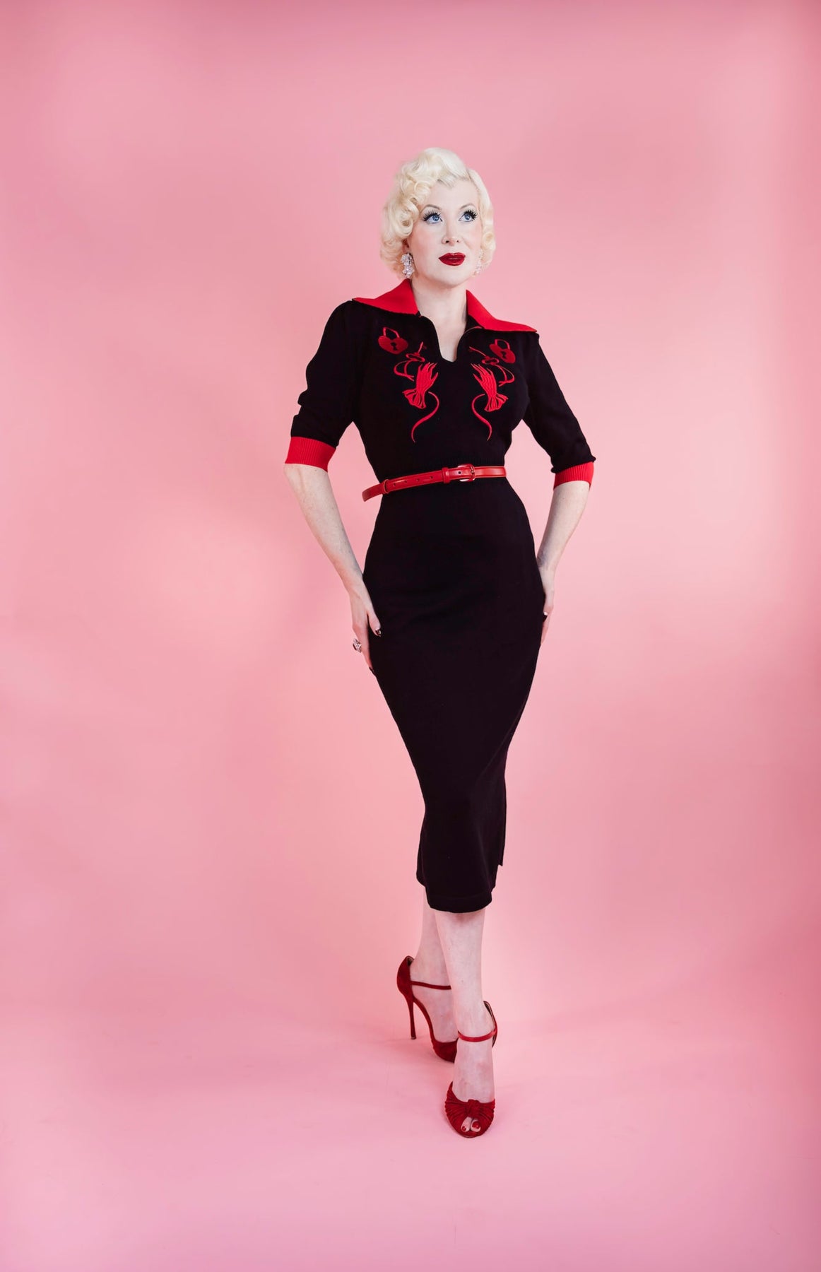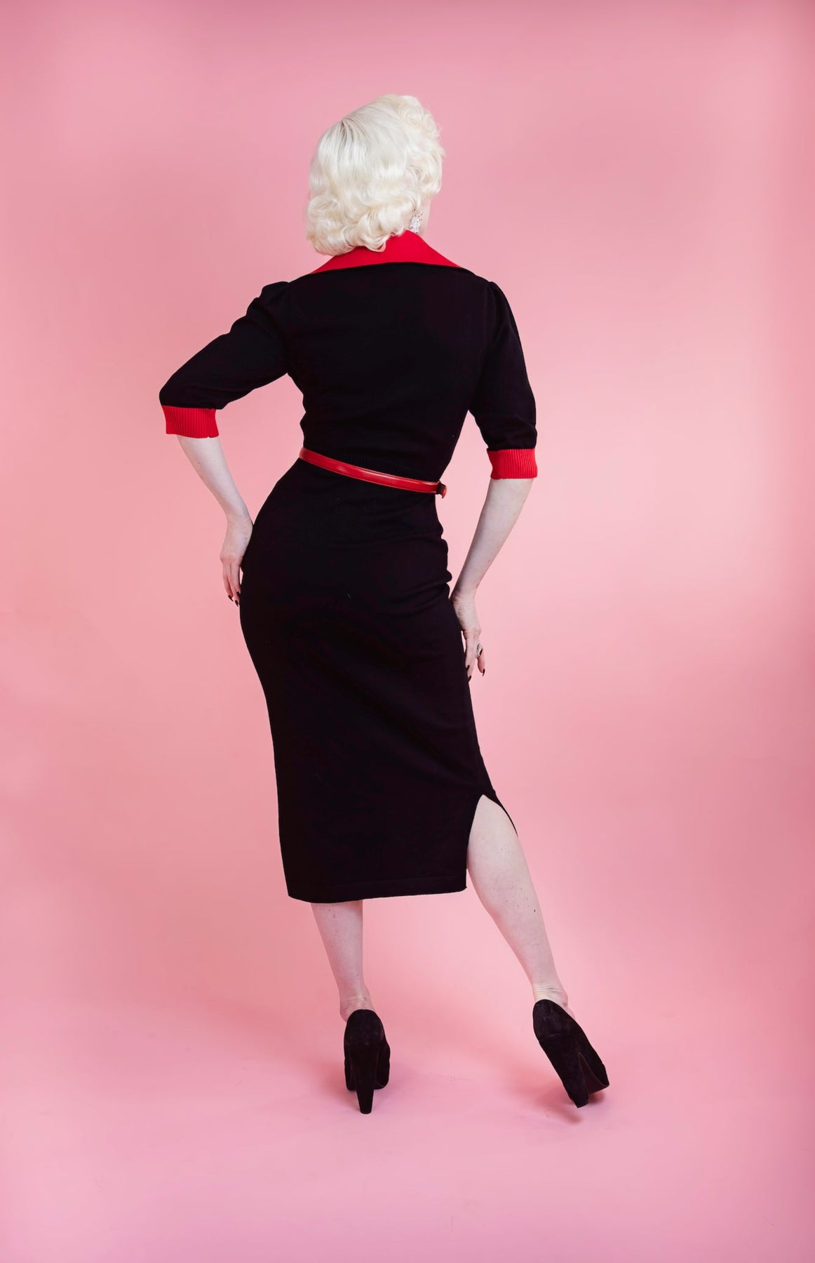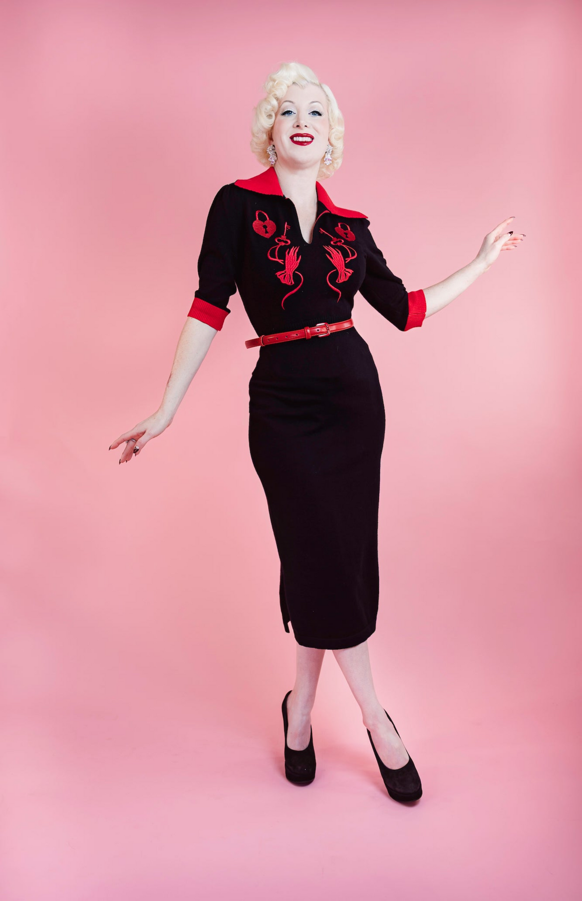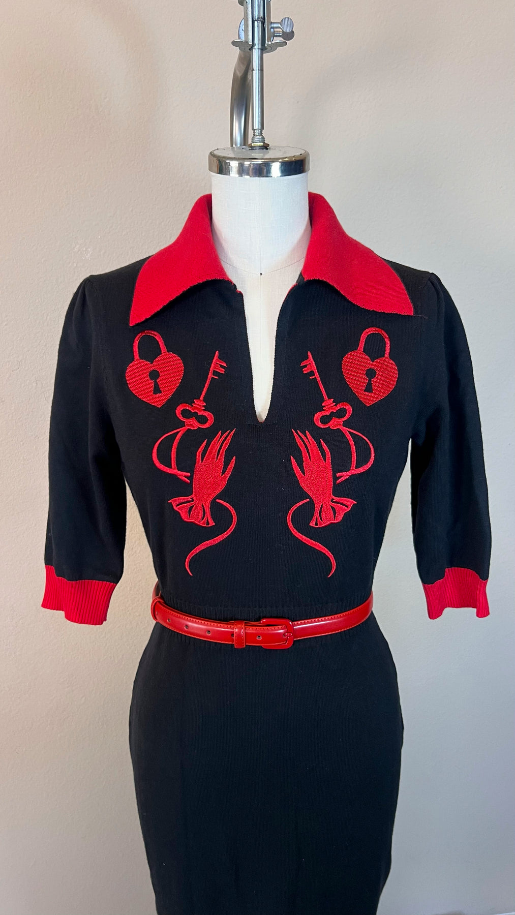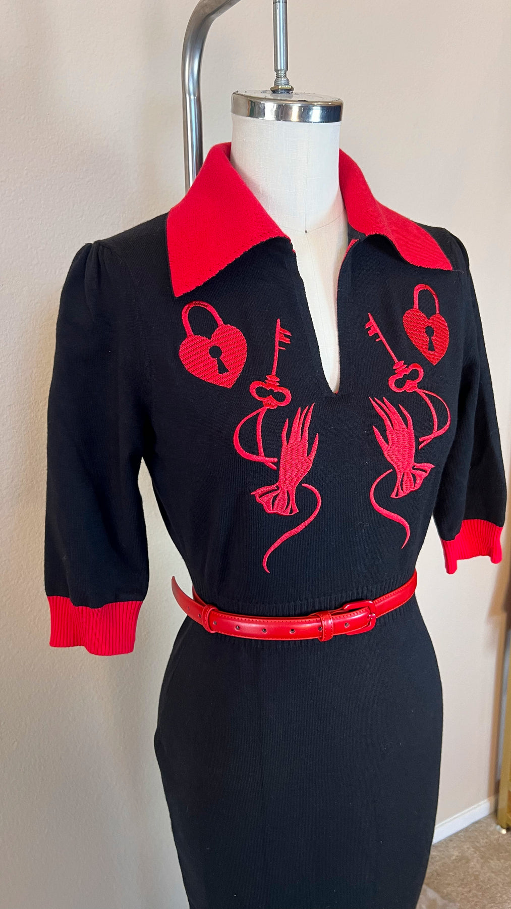 Travel to a time of classic romance with this knitted Embroidered dress featuring Lock, Key and gloved hand. With its cardigan-style construction with 1950s style rolled pointed collar and sultry silhouette, this piece blends the softness of vintage knitwear with a sharp undercurrent of intention. Crafted from a luxe medium-weight soft stretch knit acrylic, fully knitted on a loom not cut from yardage, this dress hugs the body with subtle compression and smooth structure. The figure-skimming pencil silhouette falls below the knee, giving you a timeless hourglass shape without sacrificing comfort. The fabric allows for 2-3 inches of stretch, offering both shape and flexibility. Designed under our Rebel Love Label