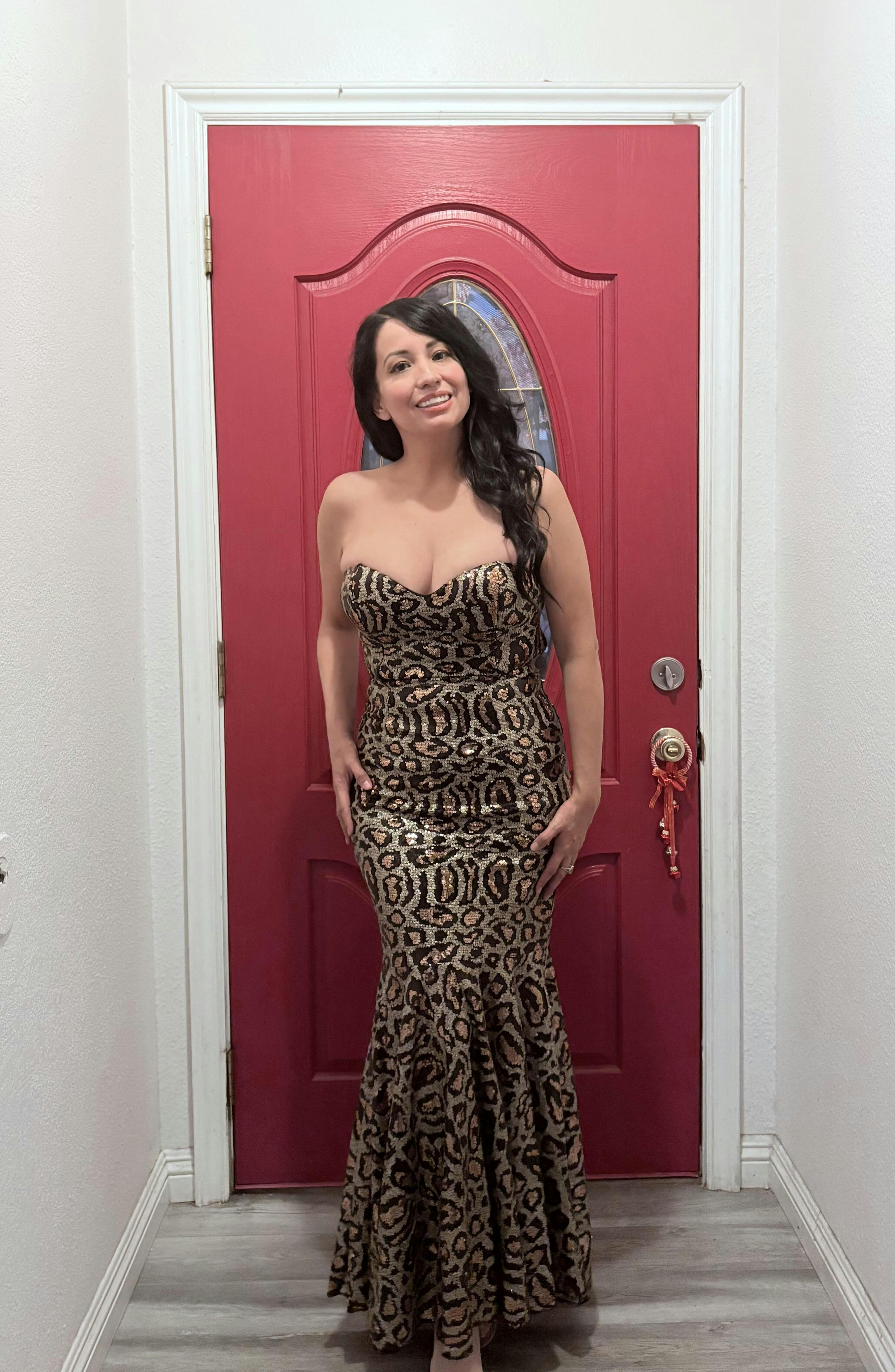 Fabric & Fit: model is 6ft with long torso, please note the bodice has the same bust coverage as our Glamour Ghoul styles. Fit mannequin in mannequin photos is scaled for 5’6 body length. Crafted from stretch leopard sequin fabric and fully lined in smooth stretch satin, this gown molds to the body while allowing movement and comfort. Side boning provides structure and support to the strapless bodice, while the fitted shape flares slightly into a mermaid hem for a dramatic finish. Measuring approximately 43 inches from waist to hem, it sweeps to full maxi length for red-carpet-worthy presence. Length is ideal for 5'4 to 5'7 but can also work for other heights, the model is 5'11