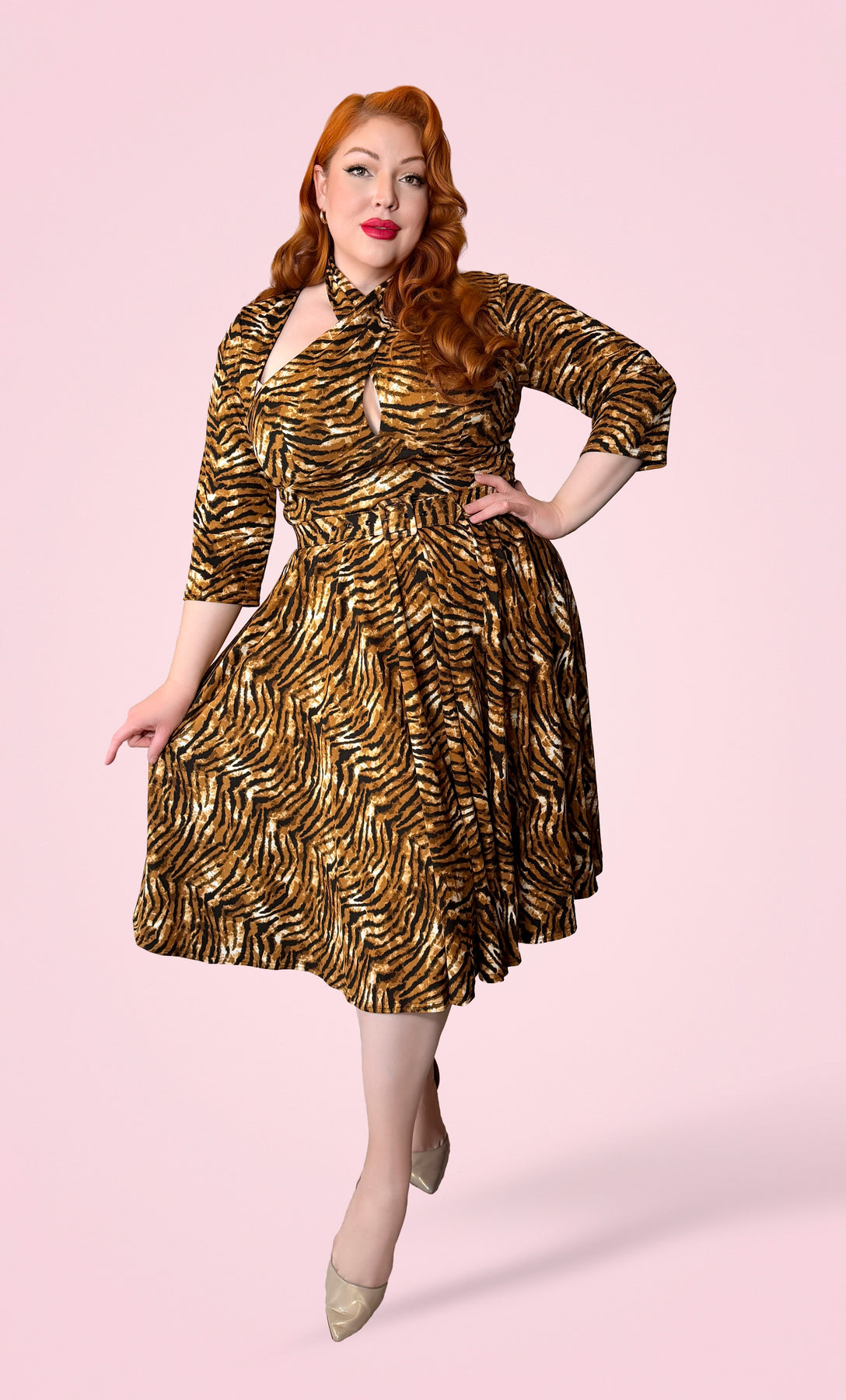 Unleash your wild side with the Tiger Print Midnight Vixen Dress, a bold twist on a classic silhouette. Equal parts fierce and feminine, this design transforms vintage glamour into untamed elegance.