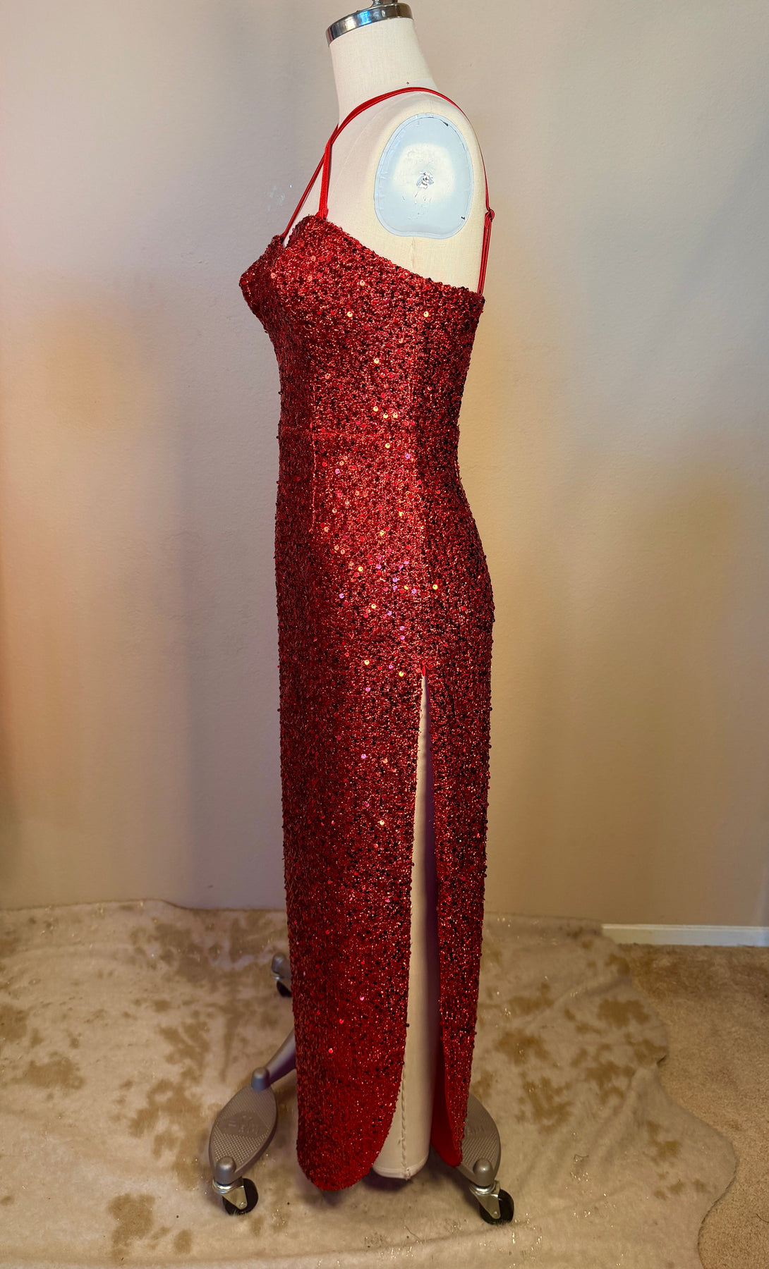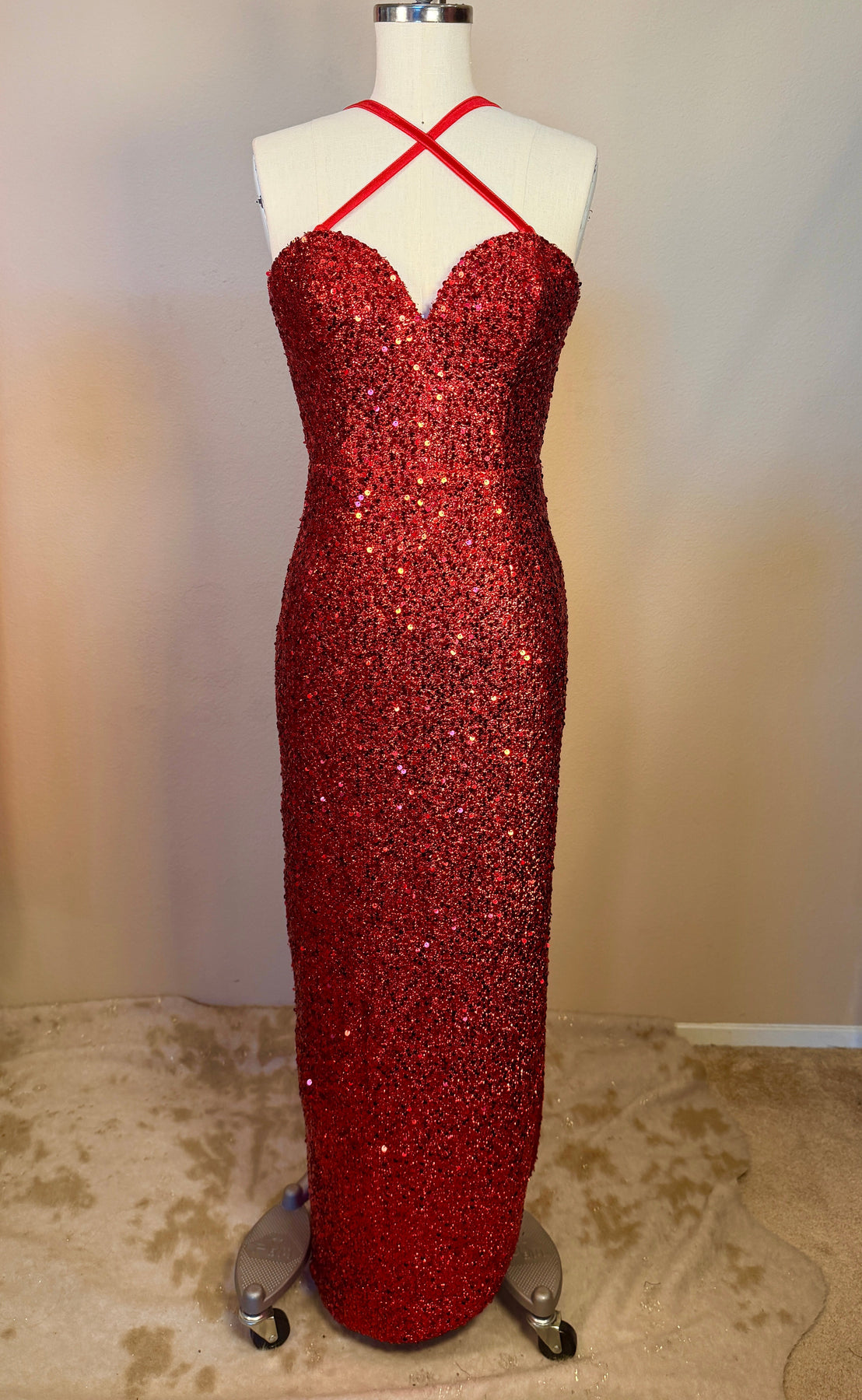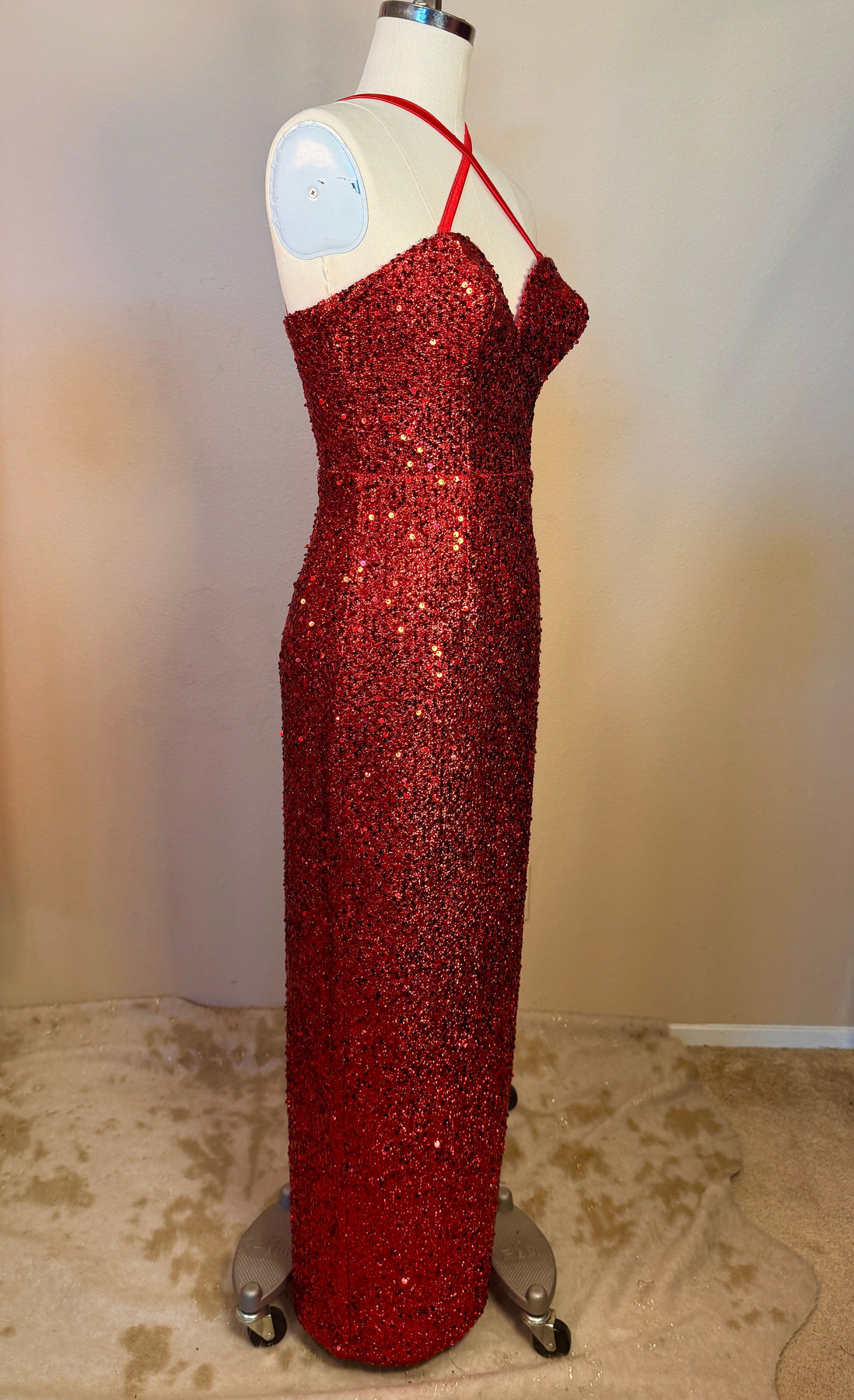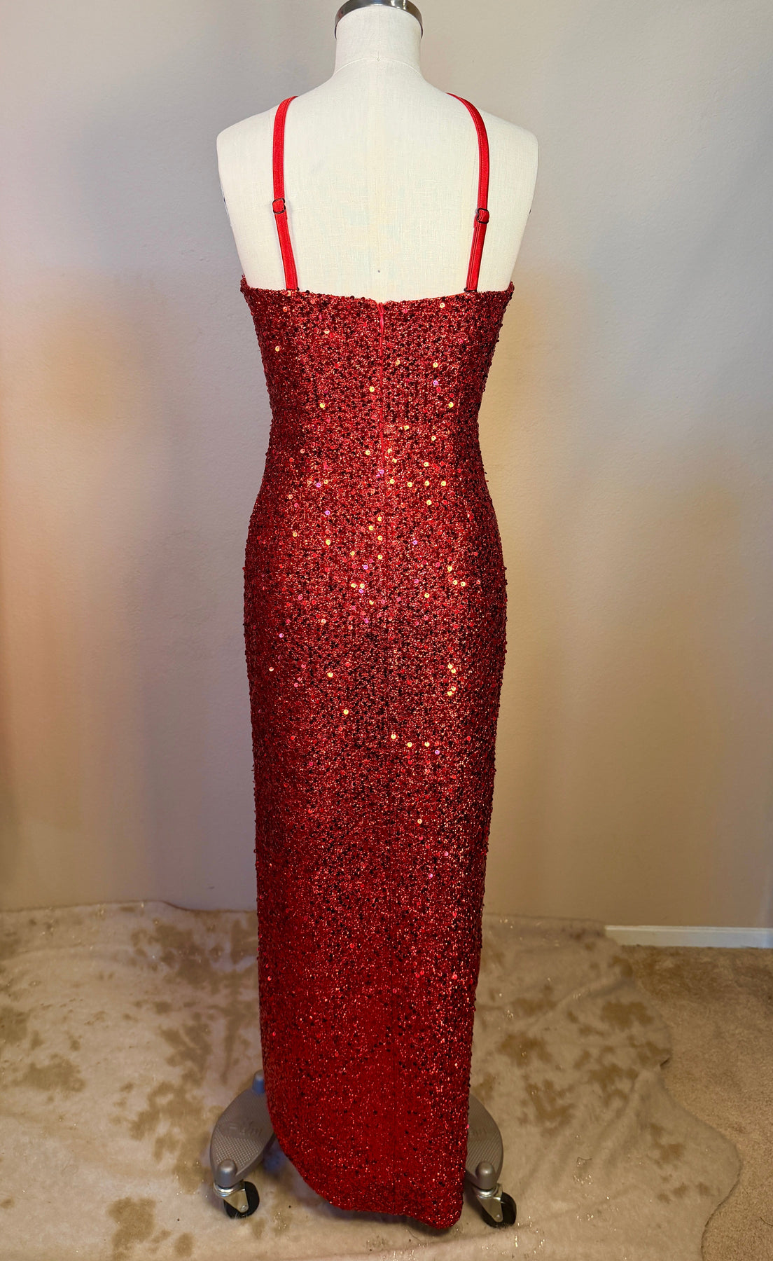The ElleRebel "In the Spotlight Dress" PREORDER—a red, metallic sequin gown with spaghetti straps, a sweetheart neckline, and a high side slit—is showcased on a dress form against a neutral background.
