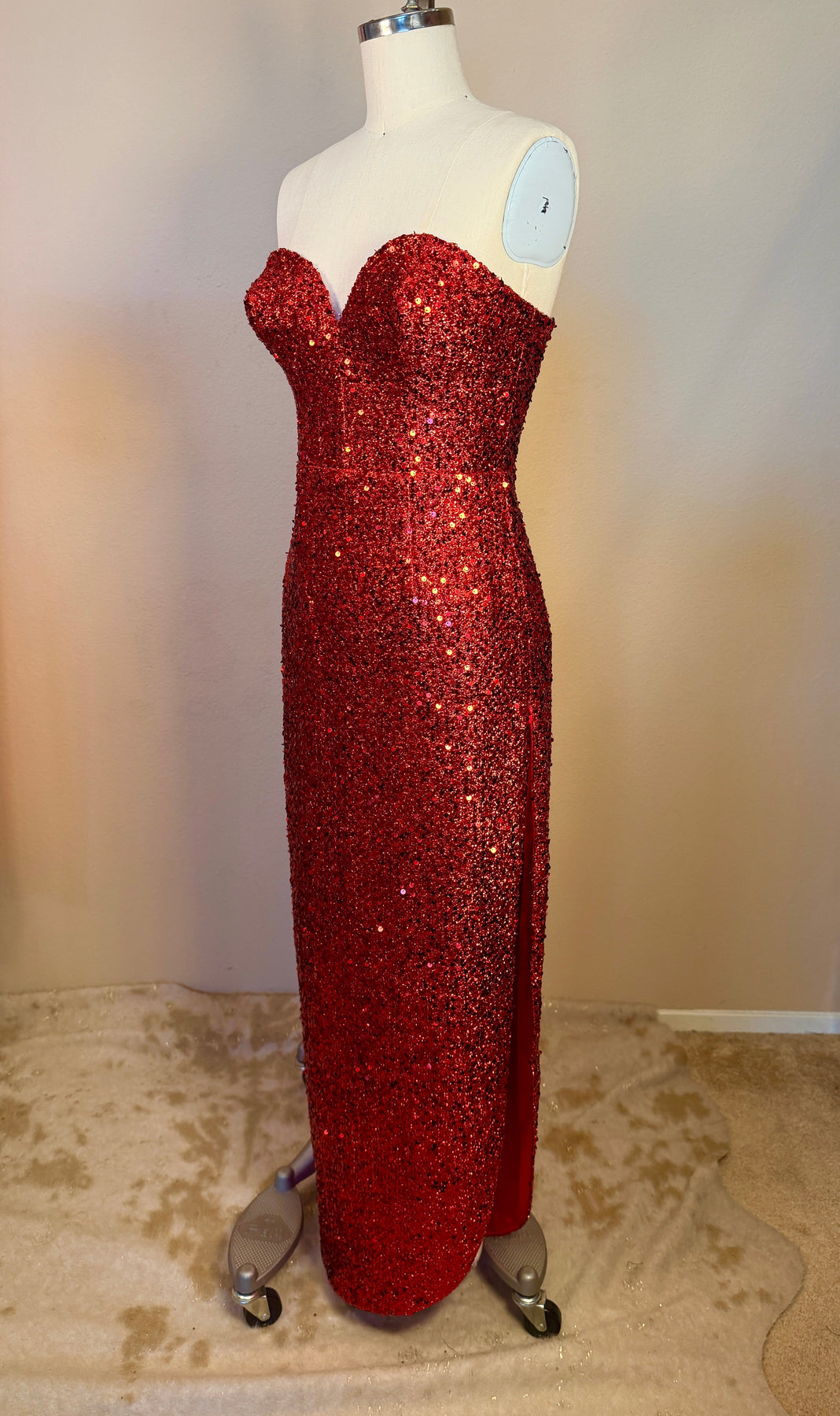 The In the Spotlight Dress PREORDER by ElleRebel, a red metallic sequin, form-fitting evening gown with a sweetheart neckline, thin straps, and side slit, is shown on a dress form against a neutral background.