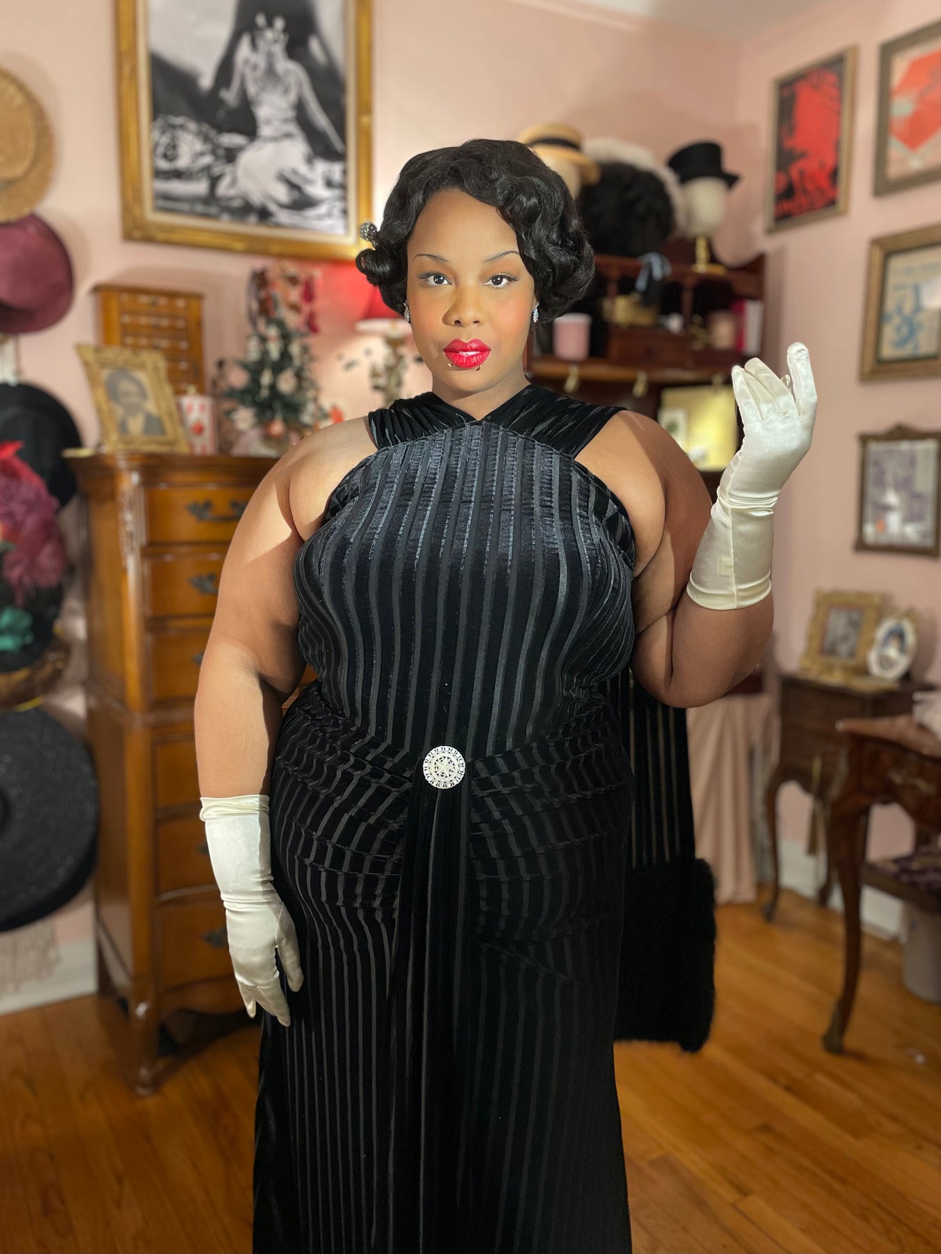 A vision of dark glamour, The Nocturne Gown channels the elegance of 1930s cinema with a sultry, femme fatale edge. With its velvety sheen and decadent faux fur trim, this gown transforms sophistication into pure intrigue. This dress is Sheer, so you can style with whatever under dressing matches your style, the gathered sash skirt in center front and back adds some visual modesty to these areas.