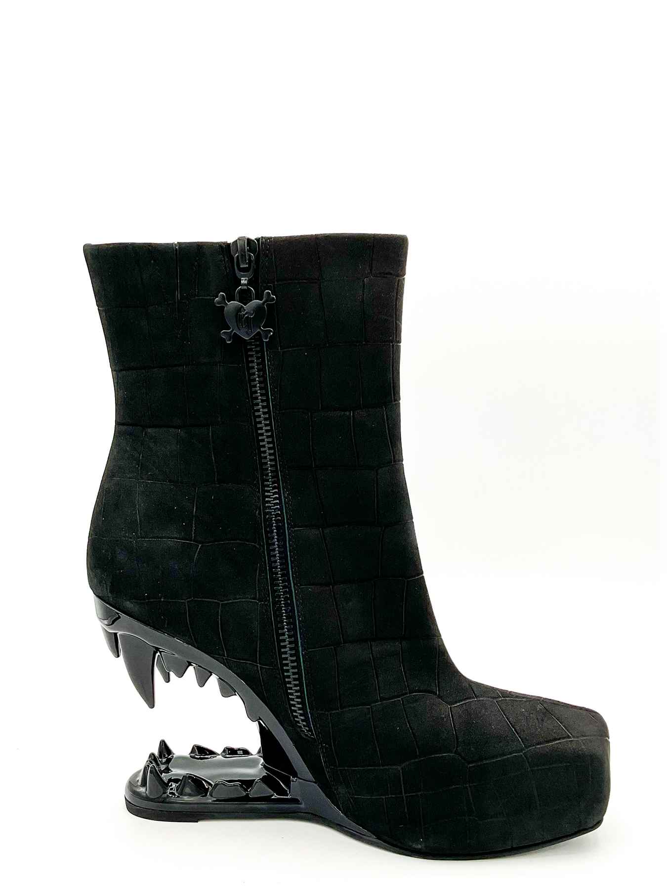 The Charla Tedrick Gnasher Boot is a black croc calf leather ankle boot with a 4" jaw-shaped sculpted heel, side zipper with skull charm, and ankle zip closure, shown against a plain white background.