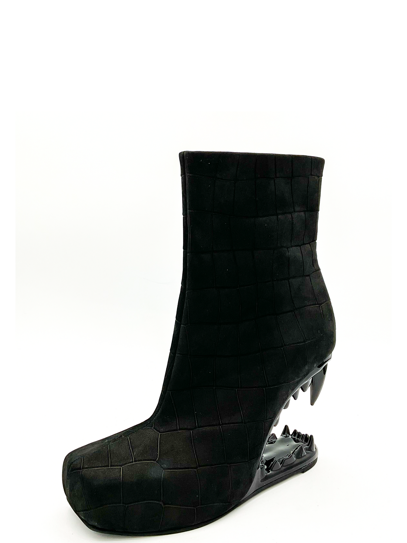 The Charla Tedrick Gnasher Boot is a black croc calf leather, square-toed ankle boot with a grid pattern, claw-like 4" sculpted heels, side zippers, and star-shaped zipper pulls.