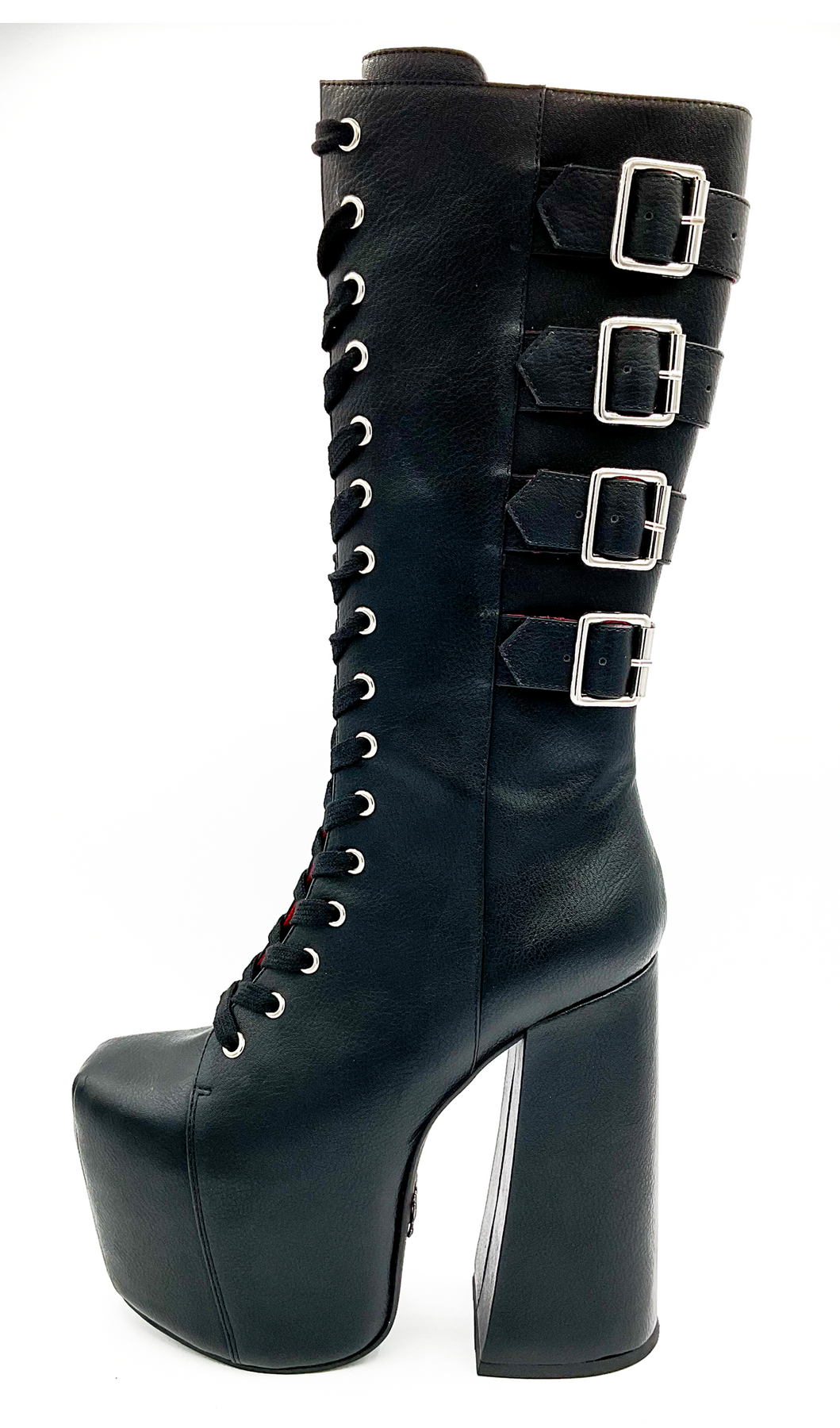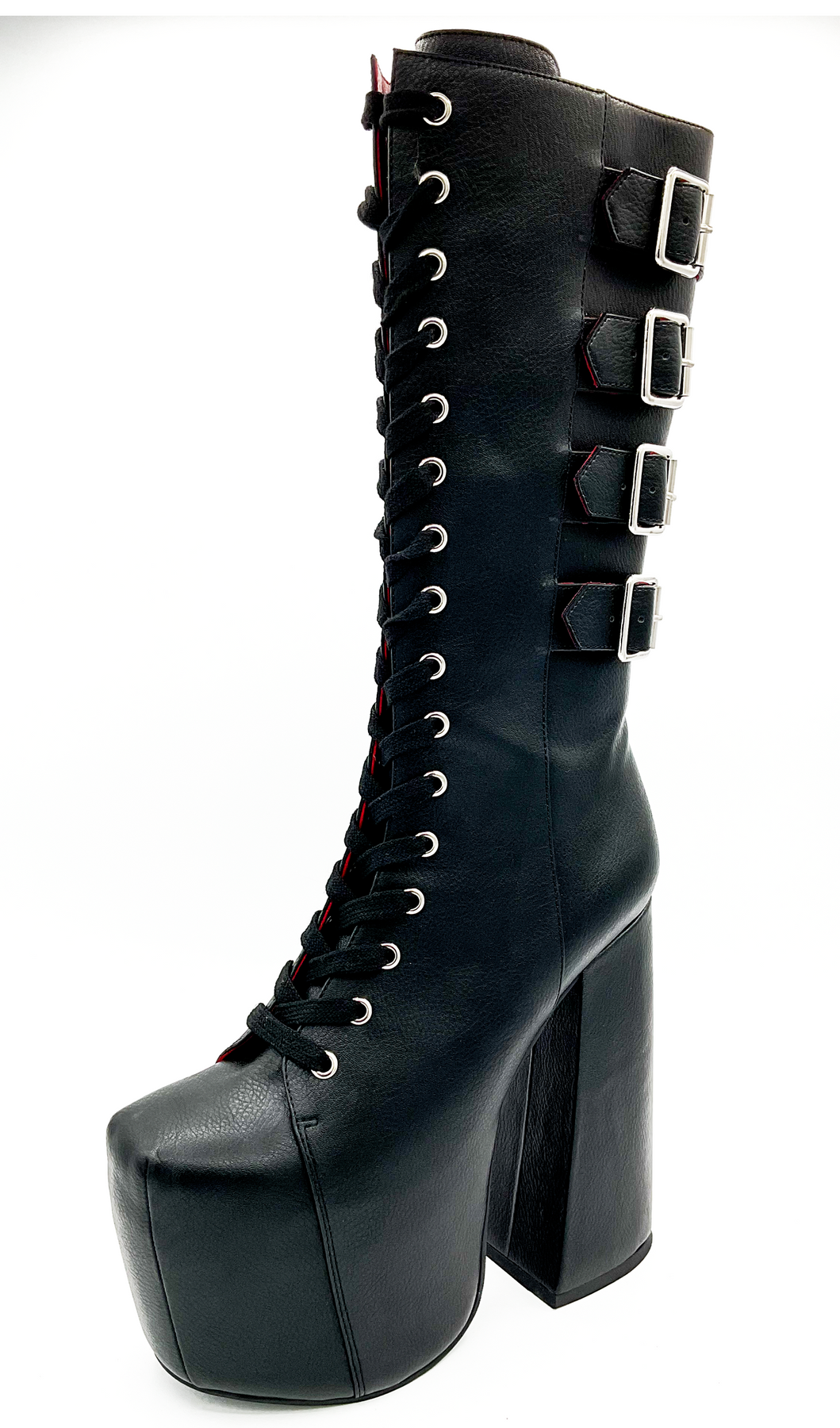The Charla Tedrick Icon 16 Buckle Boot is a black vegan leather lace-up platform with a thick high heel, square toe, silver eyelets, four side buckles, and bold red accents peeking through the lacing.