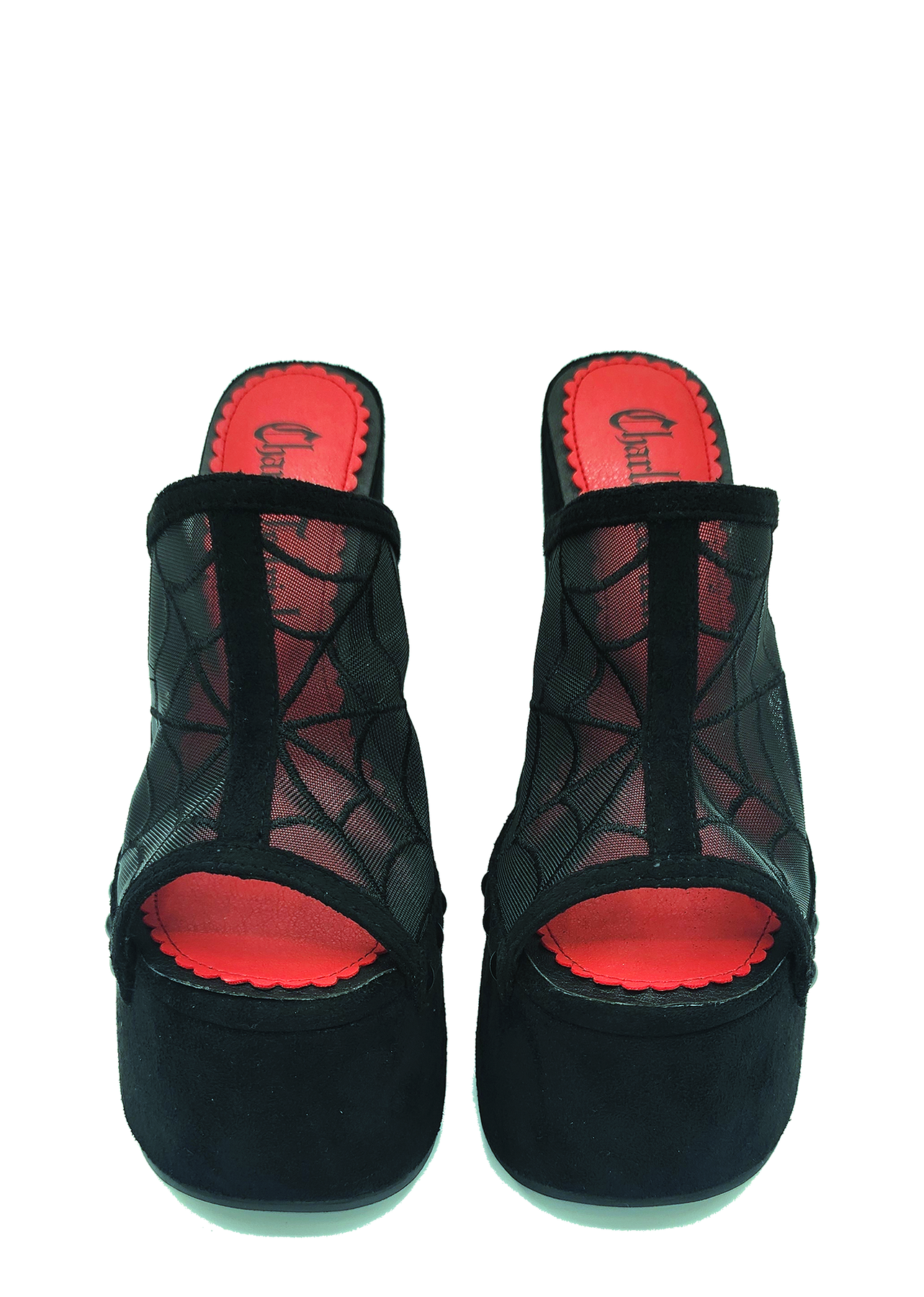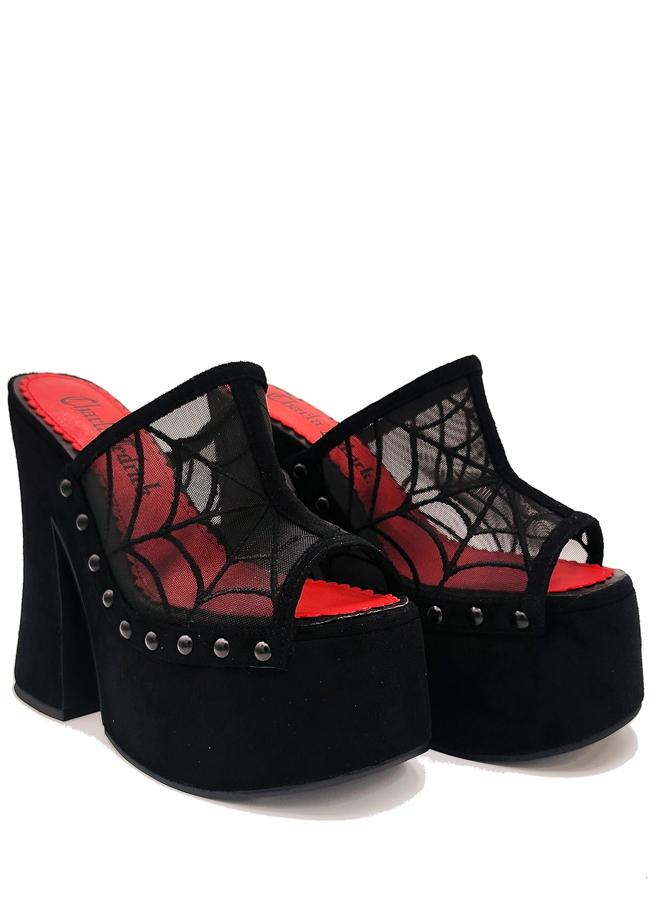 The Spinderella Platform by Charla Tedrick is a black mule with a sheer spiderweb mesh upper, chunky high heel, red insole, and studded accents—ideal for those who love bold platform wedge sandals.