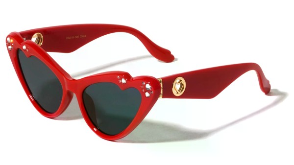 The Jeweled Heart Cat Eye Sunglasses by ElleRebel Curated feature red heart frames, dark UV 400 lenses, white rhinestones at the corners, and gold accents on the arms for a playful statement look.