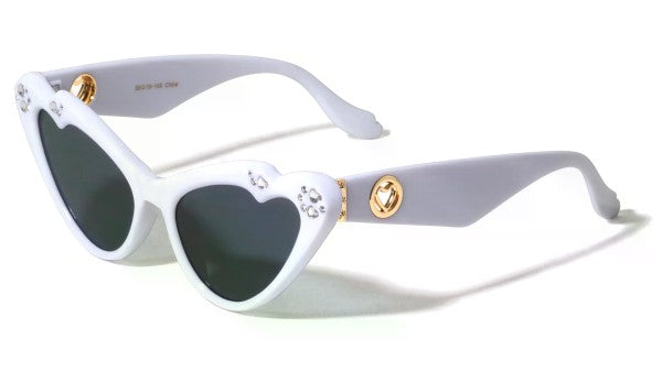 ElleRebel Curated’s Jeweled Heart Cat Eye Sunglasses feature white heart-shaped frames, dark UV400 lenses, decorative gems, and gold arm accents for a playful retro look that keeps your eyes stylishly protected.