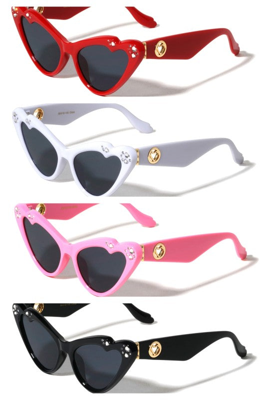 ElleRebel Curated’s Jeweled Heart Cat Eye Sunglasses come in red, white, pink, and black with dark UV400 lenses, gold logo arms, and sparkling gems—four pairs for a glamorous look.