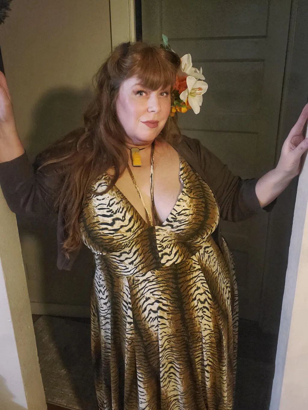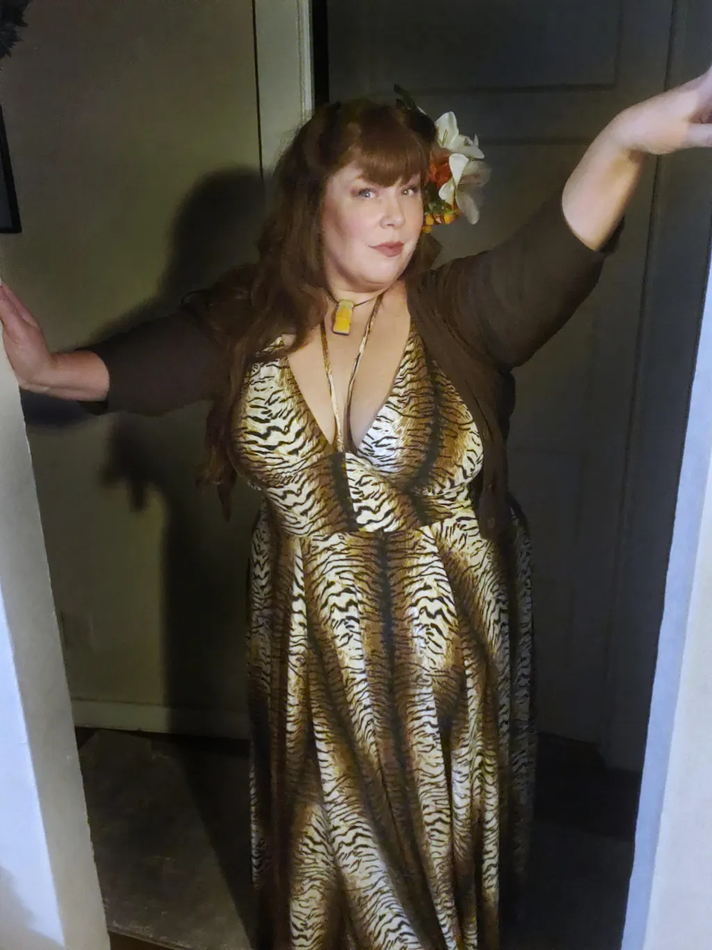 Our customer fav buttery soft Tiger Jersey fabric is back in this new Maxi Style. The Enchanted Isle Features an adjustable strap plunge front bust with center halter strap in a classic tiki style. This fabric is high stretch, so if you want more hold, we recommend sizing down.