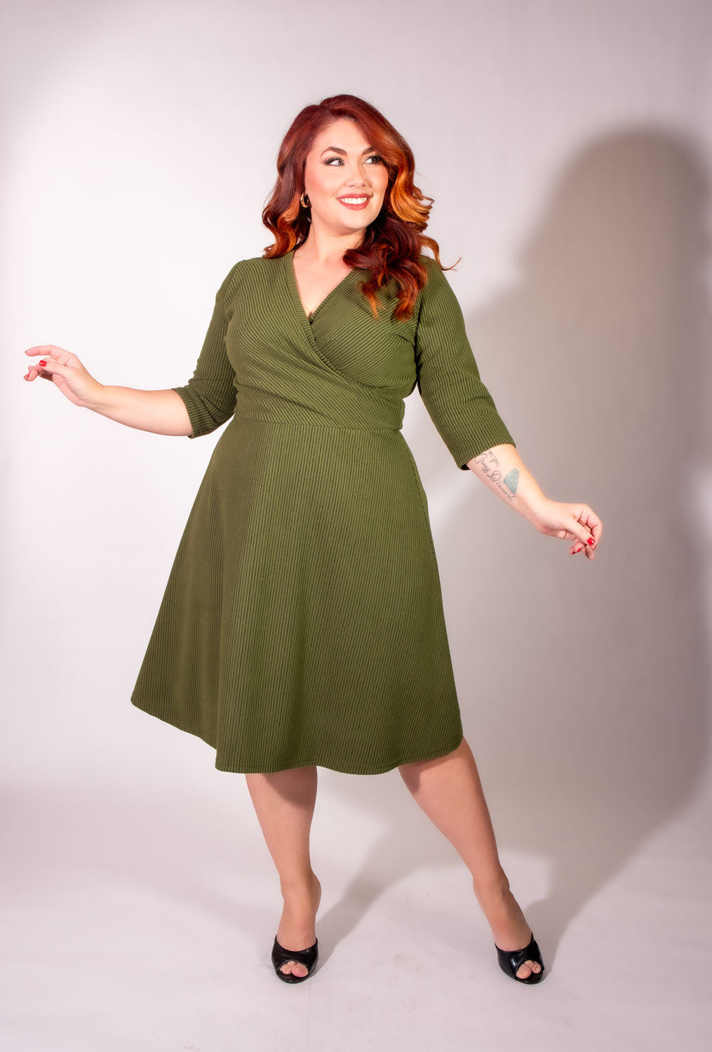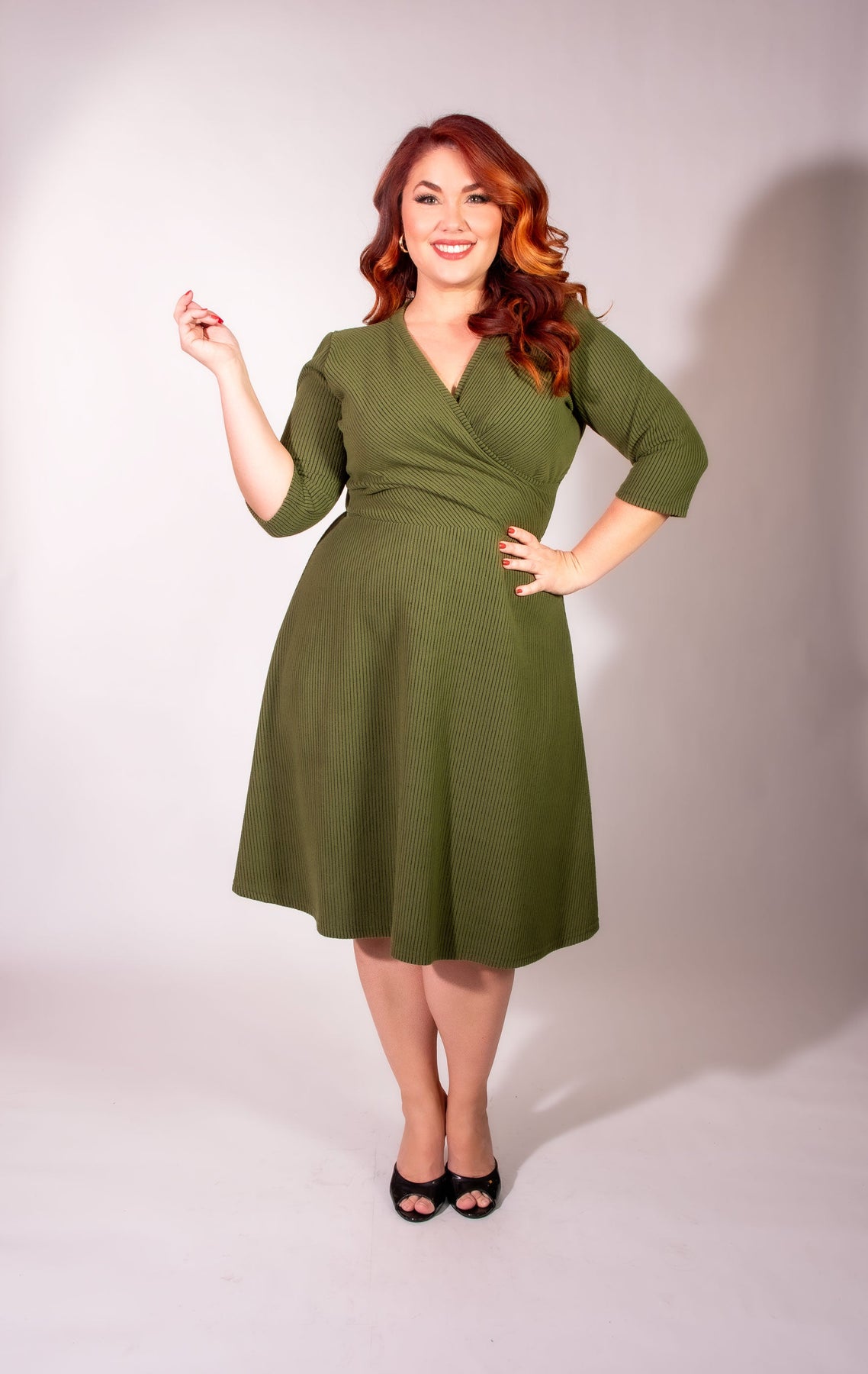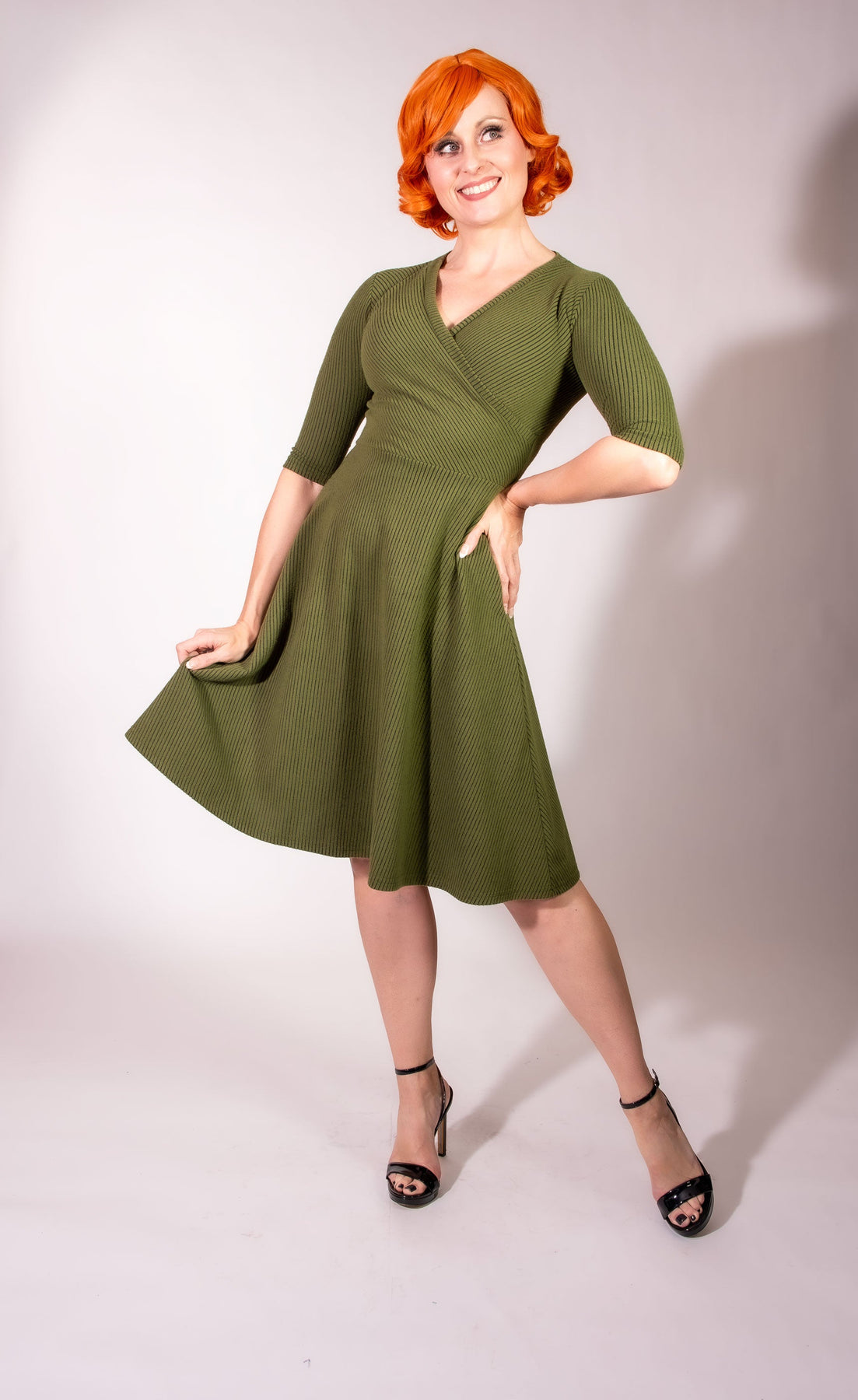 A smiling woman with short, curly red hair poses against a white background in the Heart of Haute Joanie Knit Dress 3/4 Sleeve—Olive, Brushed Rib Knit—knee-length with an elasticized waist, styled with black heels. One hand rests on her hip and one holds her dress.