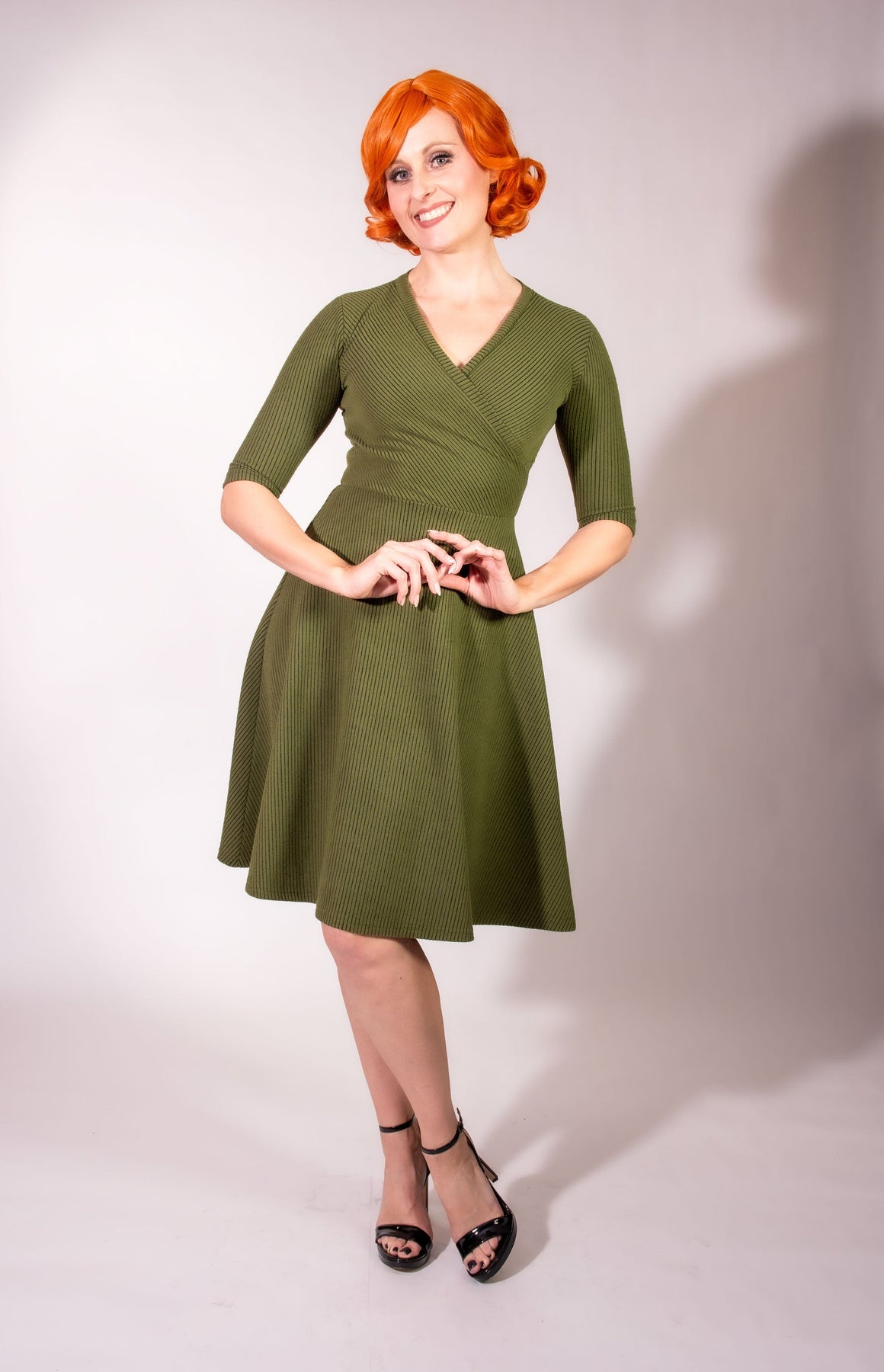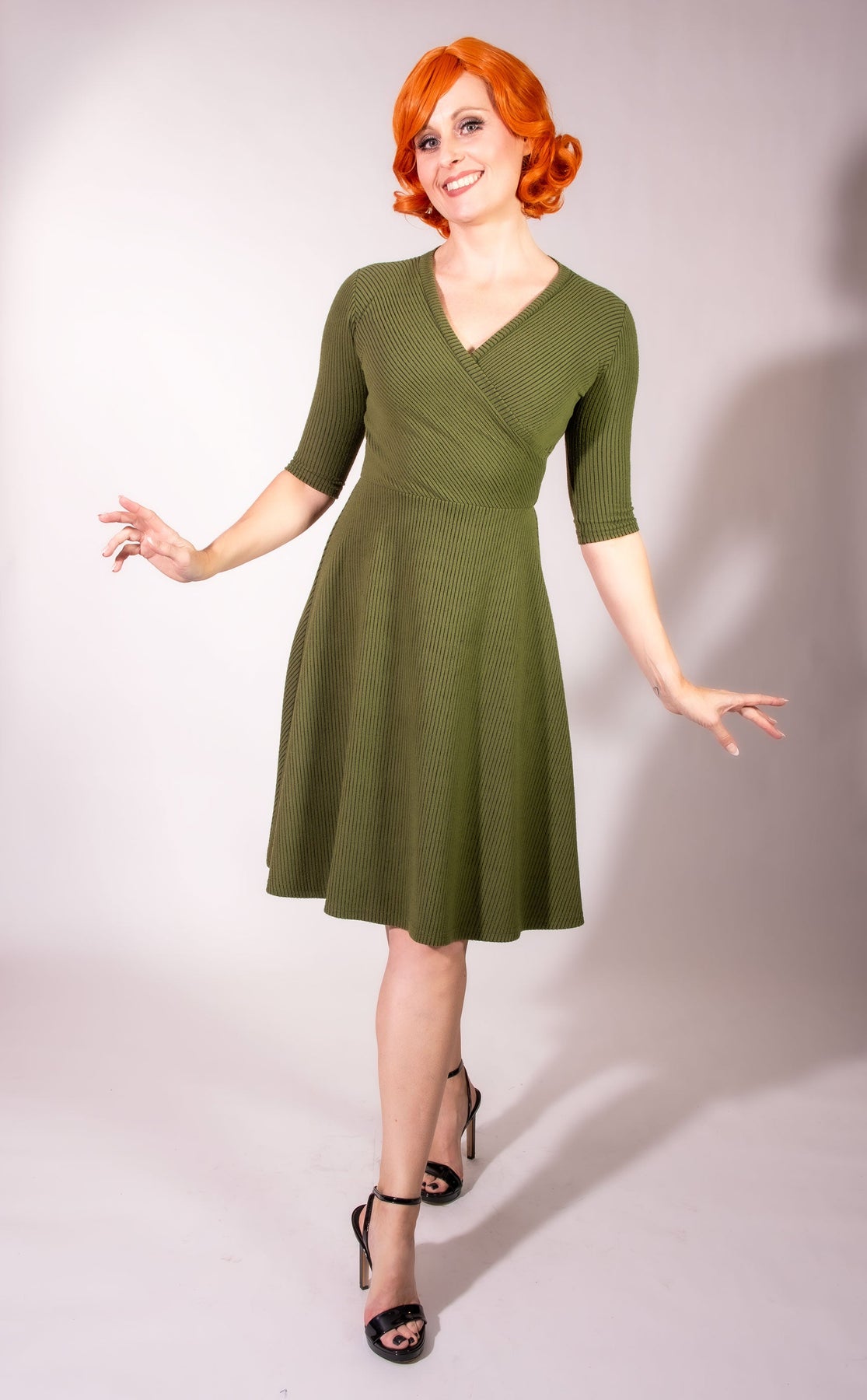 A woman with bright red wavy hair smiles and poses playfully in the Heart of Haute Joanie Knit Dress 3/4 Sleeve - Olive, featuring brushed rib knit, an elasticized waist, knee-length cut, and paired with black high-heeled sandals against a plain background.