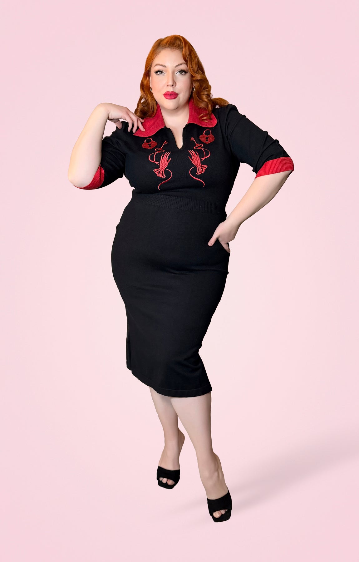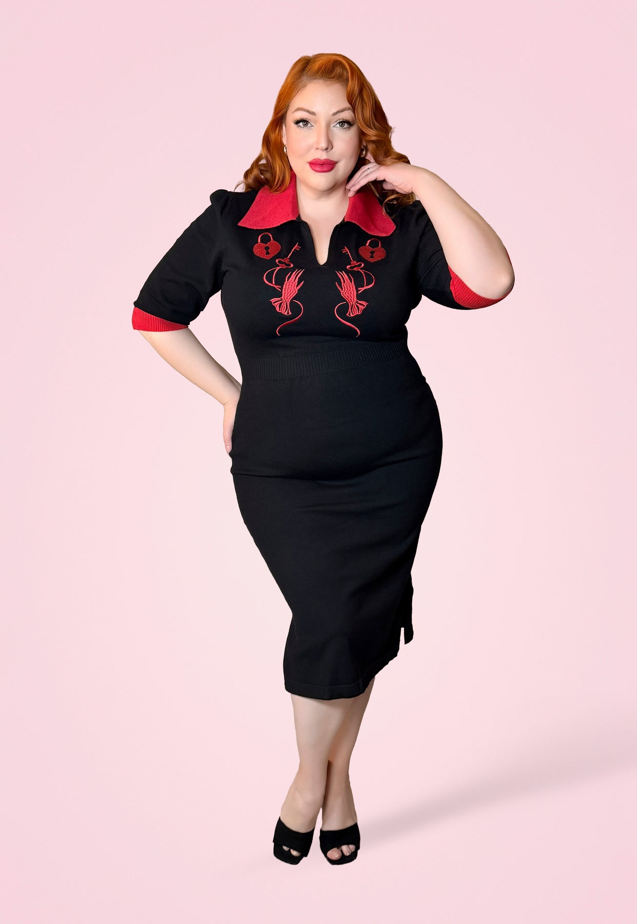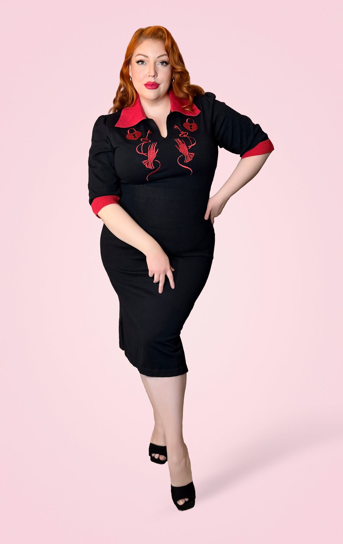 Travel to a time of classic romance with this knitted Embroidered dress featuring Lock, Key and gloved hand. With its cardigan-style construction with 1950s style rolled pointed collar and sultry silhouette, this piece blends the softness of vintage knitwear with a sharp undercurrent of intention. Crafted from a luxe medium-weight soft stretch knit acrylic, fully knitted on a loom not cut from yardage, this dress hugs the body with subtle compression and smooth structure. The figure-skimming pencil silhouette falls below the knee, giving you a timeless hourglass shape without sacrificing comfort. The fabric allows for 2-3 inches of stretch, offering both shape and flexibility. Designed under our Rebel Love Label