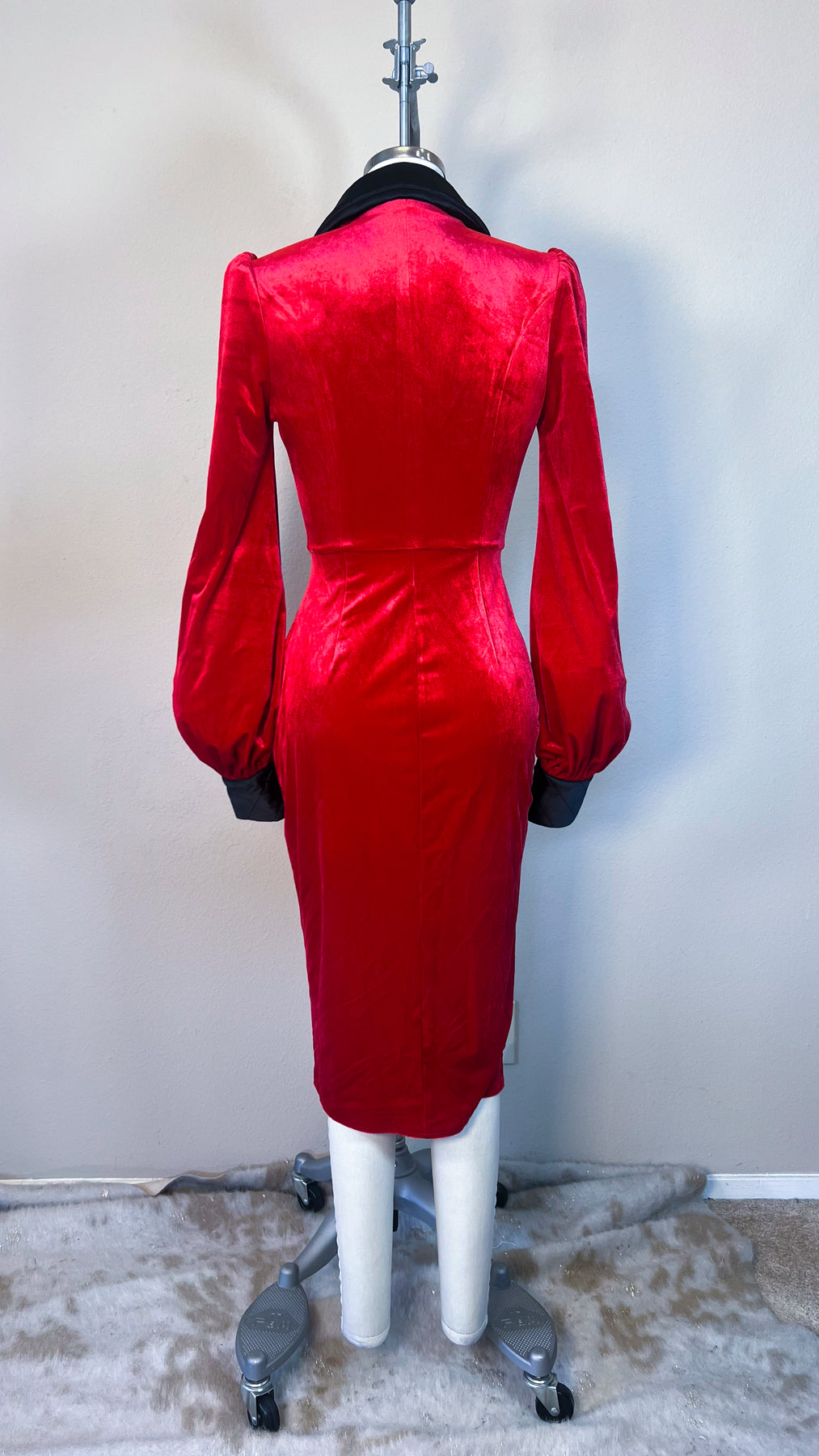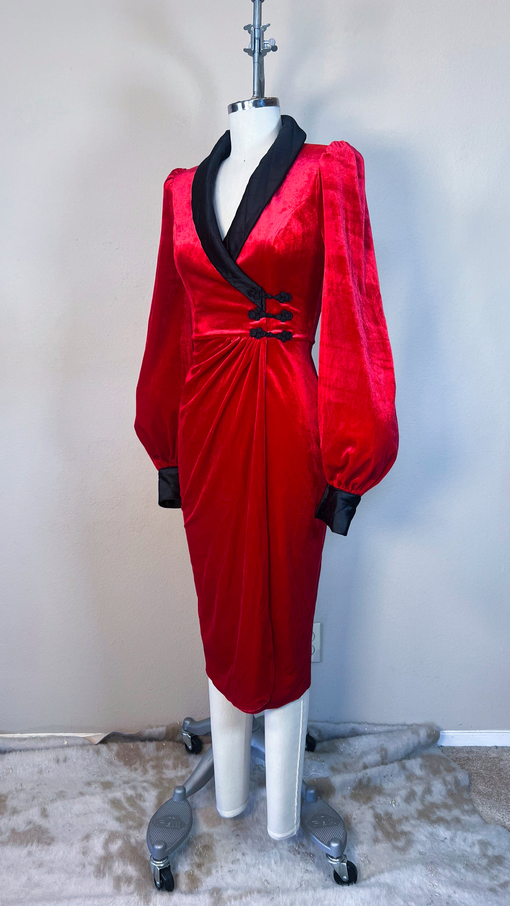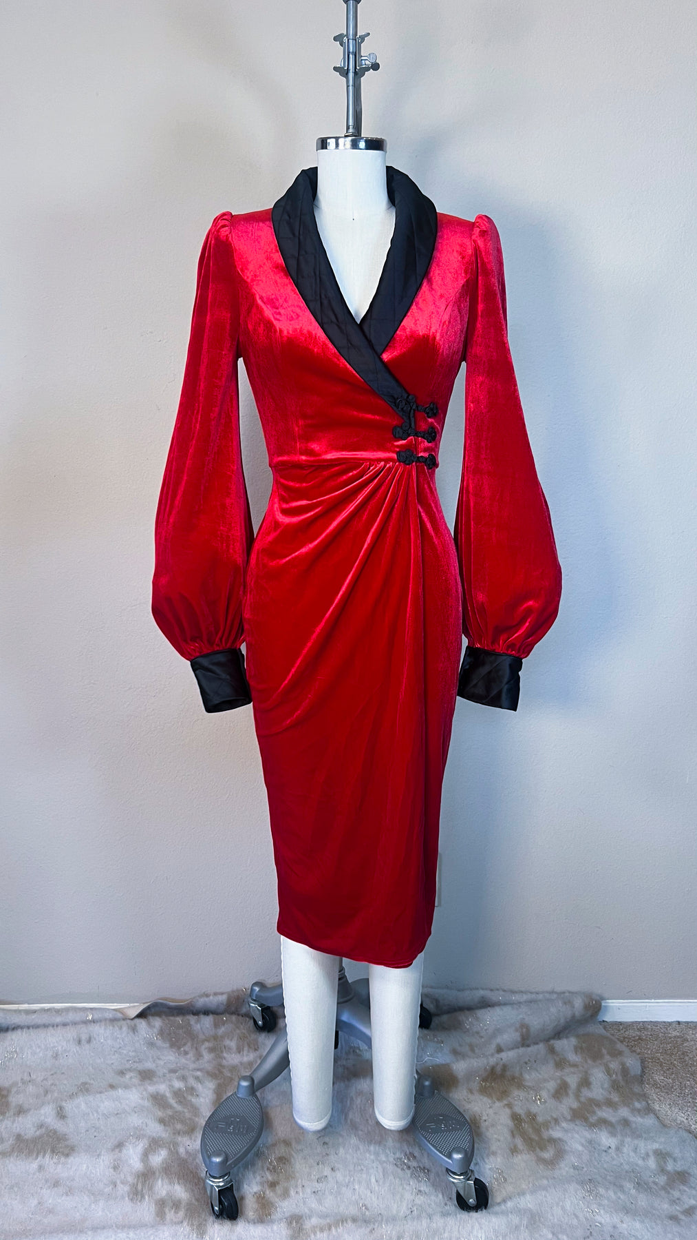 Fabric & Fit: Crafted from stretch velvet with a smooth satin lining, the Sinatra Smoking Jacket Dress sculpts the figure into a flawless hourglass silhouette. A dramatic rolled satin collar frames the neckline, while bishop sleeves with quilted satin cuffs add depth and decadence. Functional knot buttons secure the wrap closure and allow slight adjustability at the waist, with the skirt falling approximately 28 inches from waist to hem.