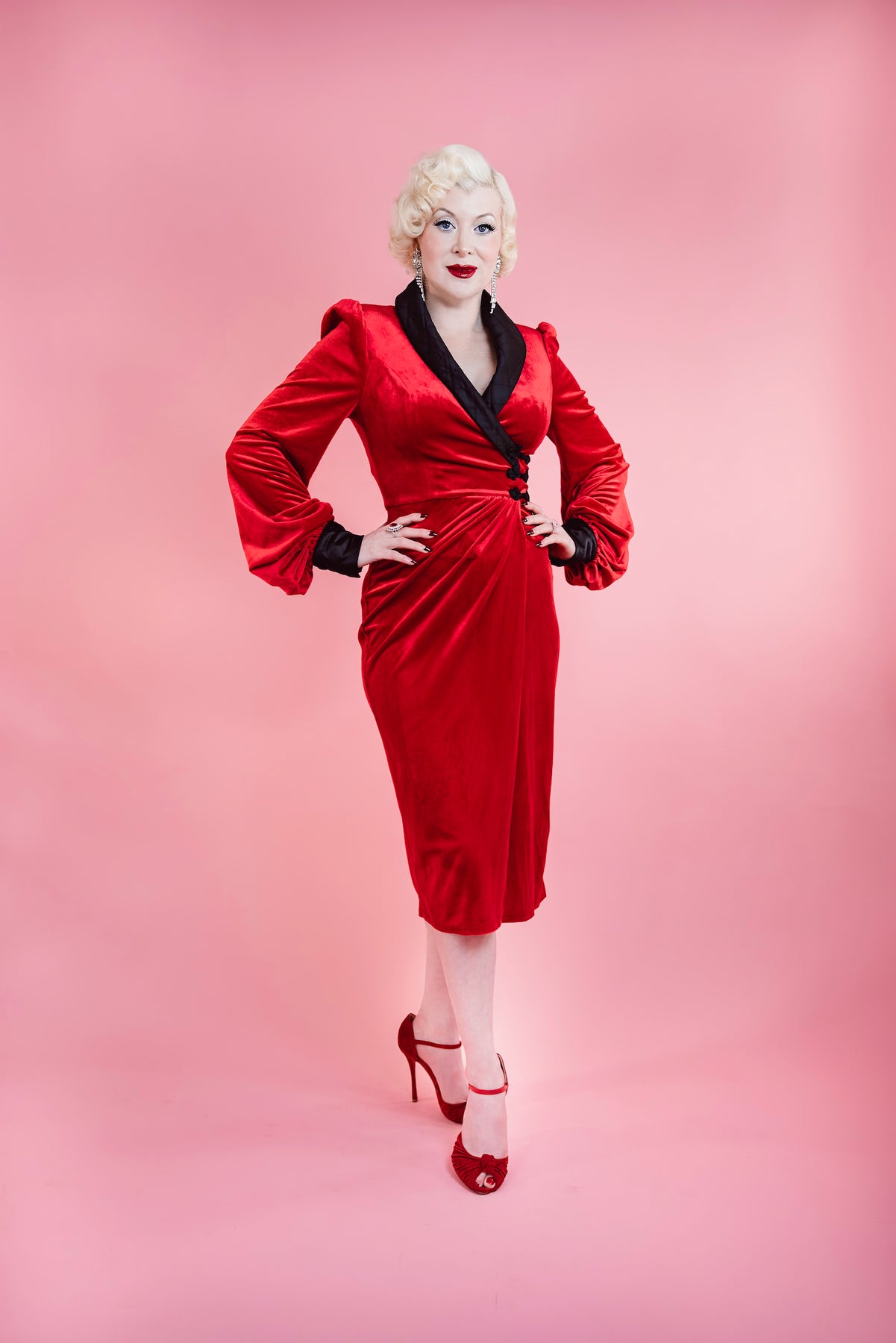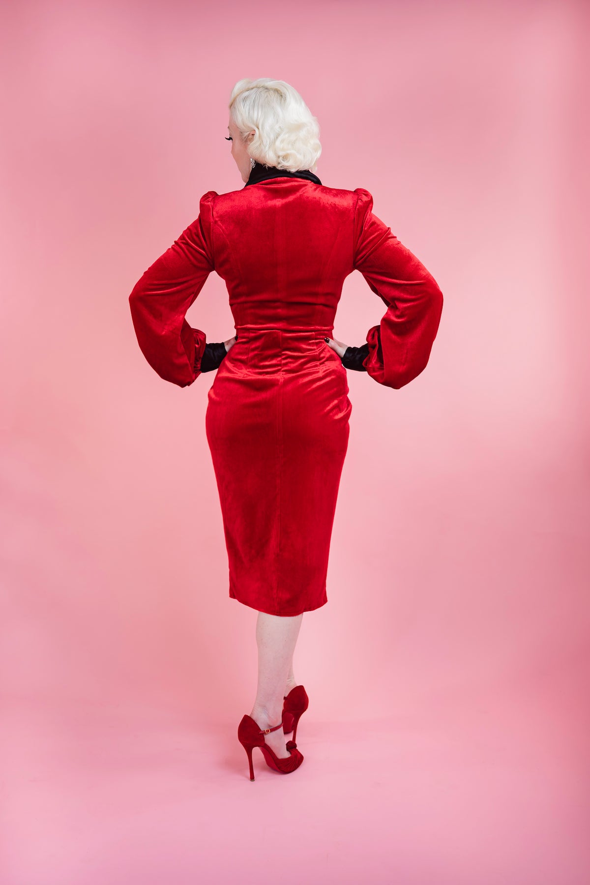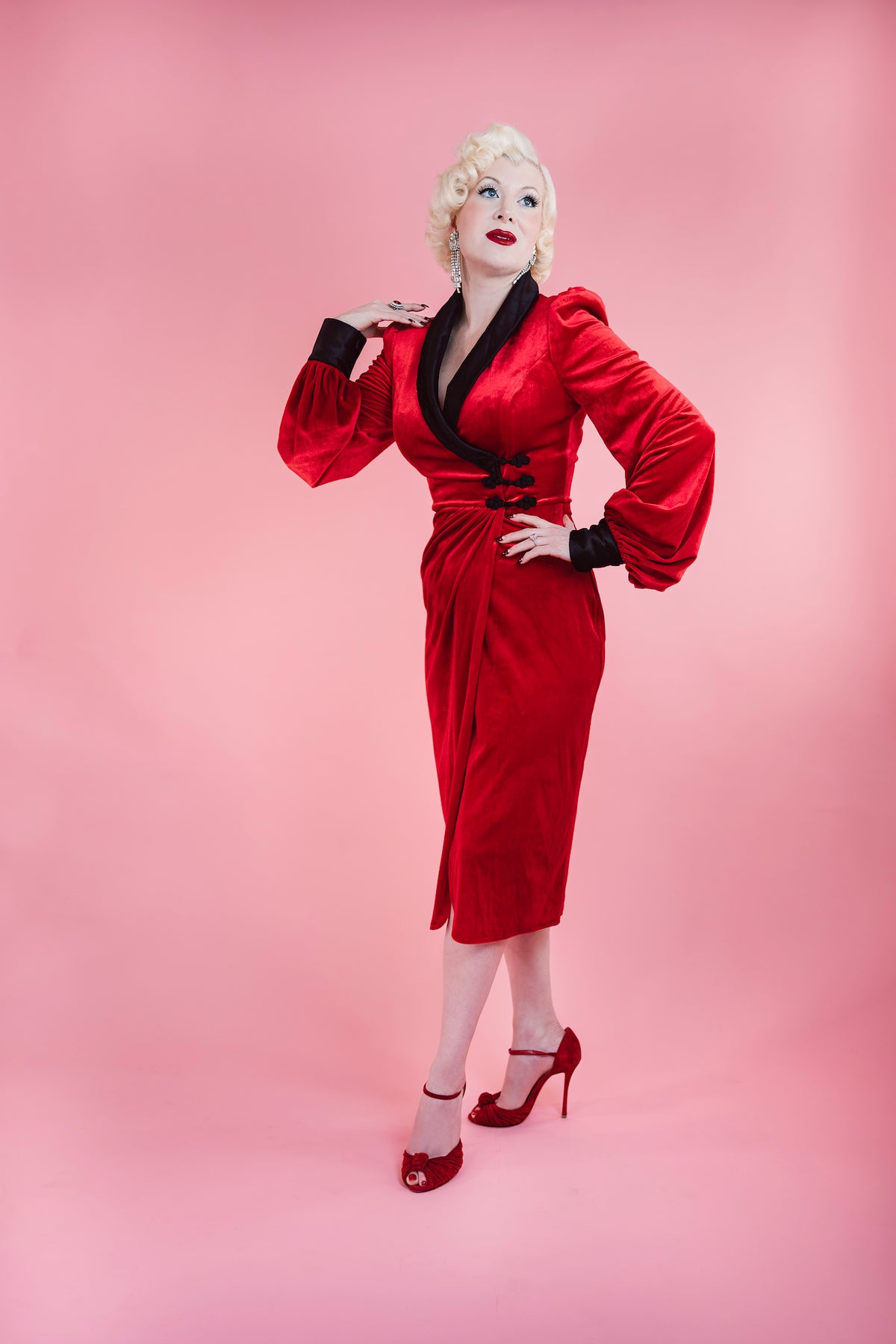 Fabric & Fit: Crafted from stretch velvet with a smooth satin lining, the Sinatra Smoking Jacket Dress sculpts the figure into a flawless hourglass silhouette. A dramatic rolled satin collar frames the neckline, while bishop sleeves with quilted satin cuffs add depth and decadence. Functional knot buttons secure the wrap closure and allow slight adjustability at the waist, with the skirt falling approximately 28 inches from waist to hem.
