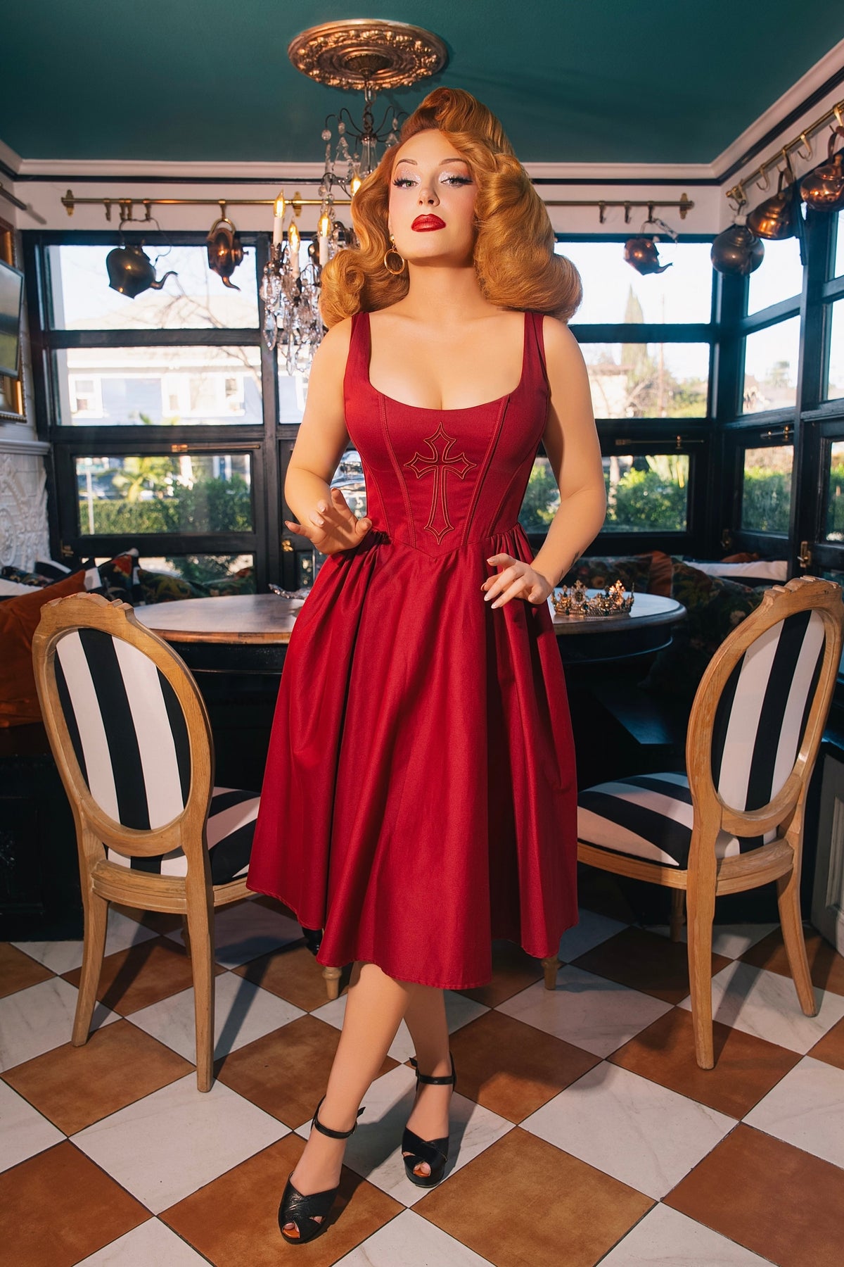 A woman with styled red hair wears the Gabriela Cross Swing Dress in Wine by WEASEL WEAR and black heels, standing in a vintage-inspired dining room with checkered floors, striped chairs, and large windows.
