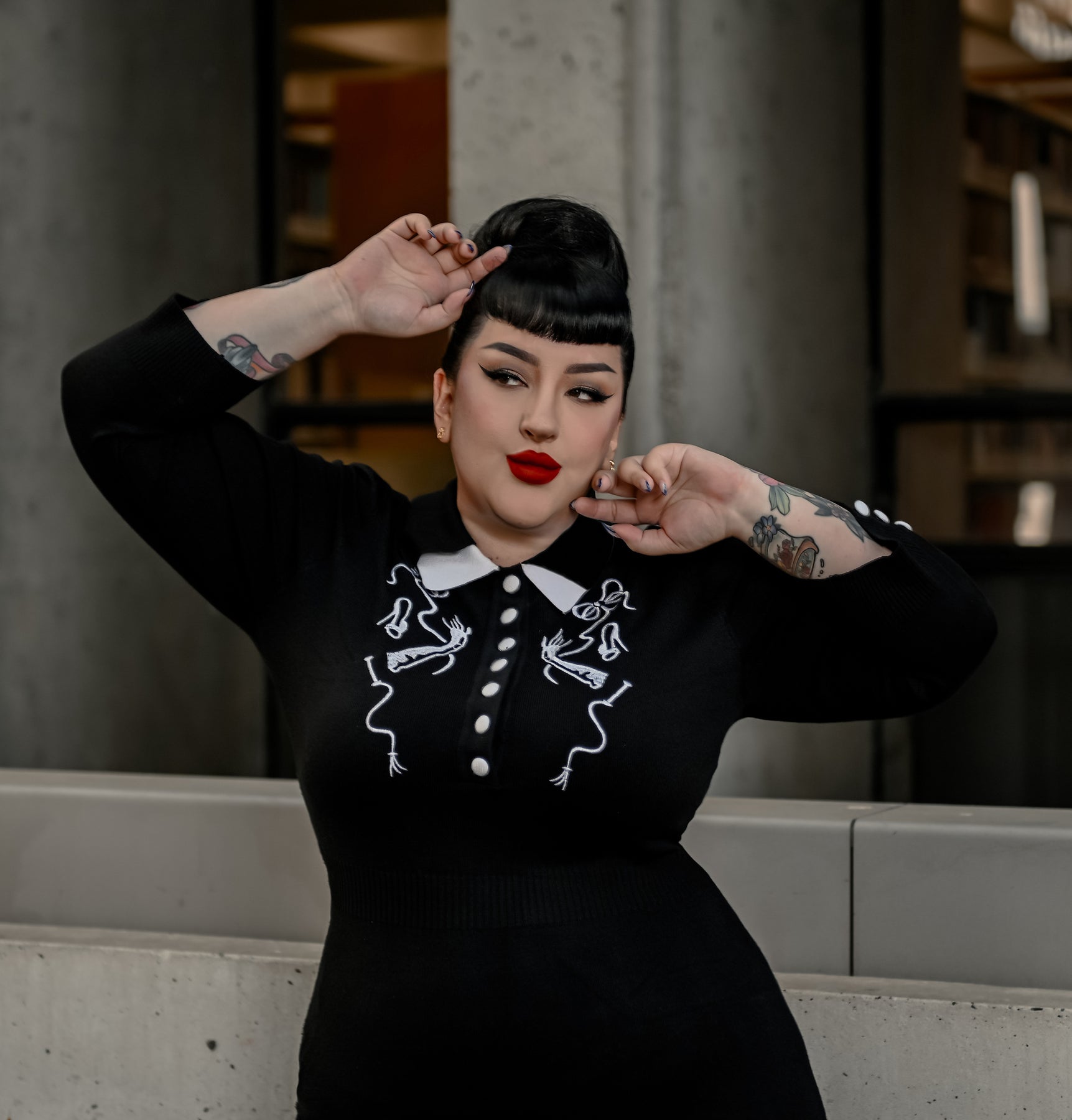 Fabric & Fit: Made of soft knitted acrylic. Custom ivory embroidery across the bust features a symbolic femme fatale trio: a coiled whip, opera gloves, and dainty kitten heels hand drawn by Larissa Pinup Art.