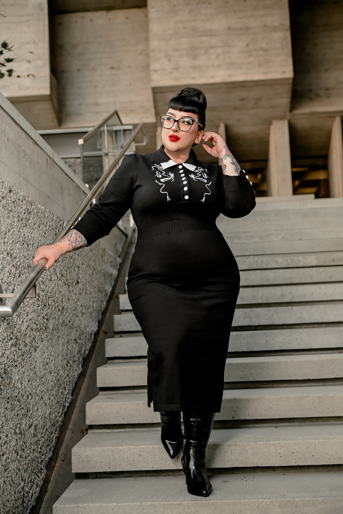 The Art of Temptation Dress captures the allure of a 1950s femme fatale, our ode to the Queen of Burlesque. Embroidery features bows, Whips, gloves and high heels. With its cardigan-style construction with a unique double layer collar and sultry silhouette, this piece blends the softness of vintage knitwear with a sharp undercurrent of intention. Crafted from a luxe medium-weight soft stretch knit acrylic, fully knitted on a loom not cut from yardage, this dress hugs the body with subtle compression and smooth structure. The figure-skimming pencil silhouette falls below the knee, giving you a timeless hourglass shape without sacrificing comfort. The fabric allows for 2-3 inches of stretch, offering both shape and flexibility. Designed under our Rebel Love Label