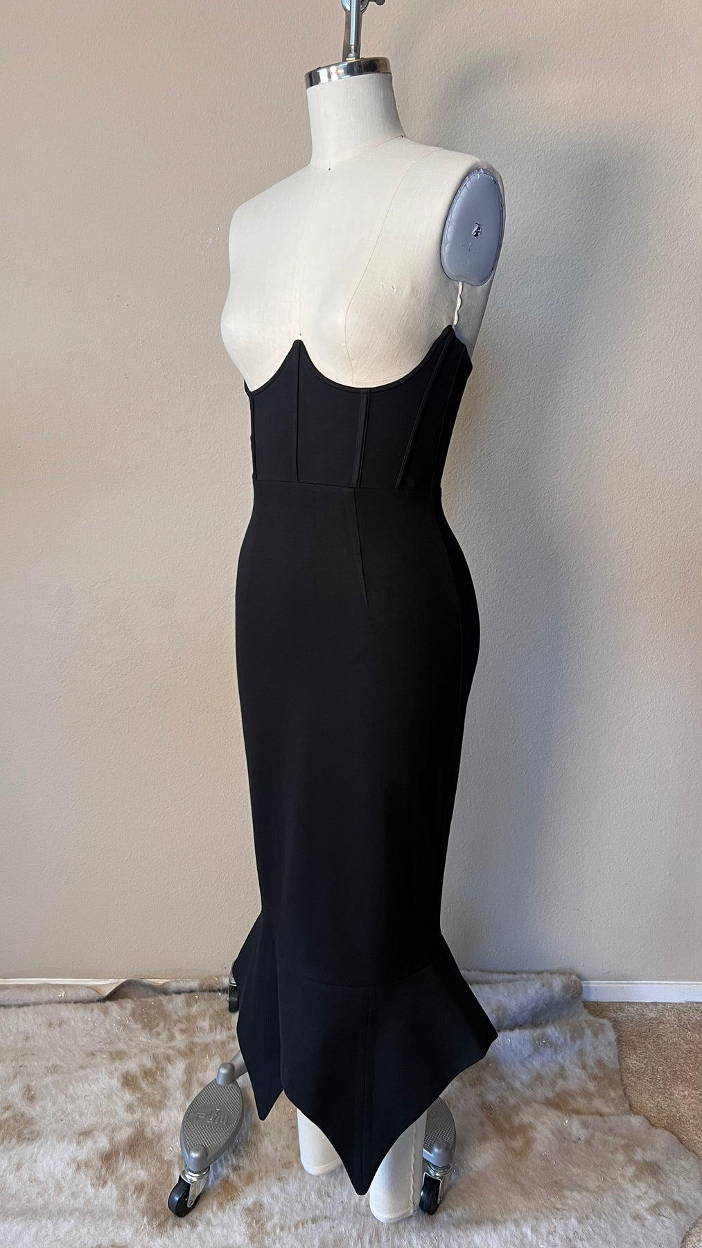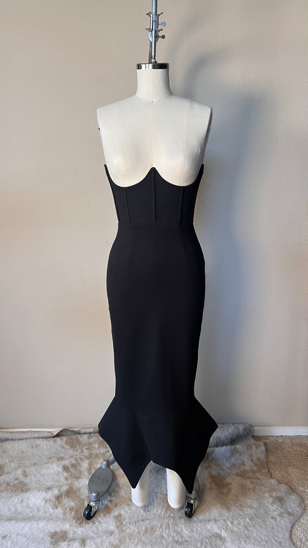 Dangerously chic, the De la Noche Bat Wing Skirt channels the noir seduction of 1940s femme fatales with Mugler-inspired drama. Its super high waist is boned to cinch the body into a striking hourglass, underwire bust creates a unique accent, while the fitted structure skims down to a calf-length hem that flares into an irregular bat-like finish. The effect is sleek, sculpted, and unapologetically vampy.