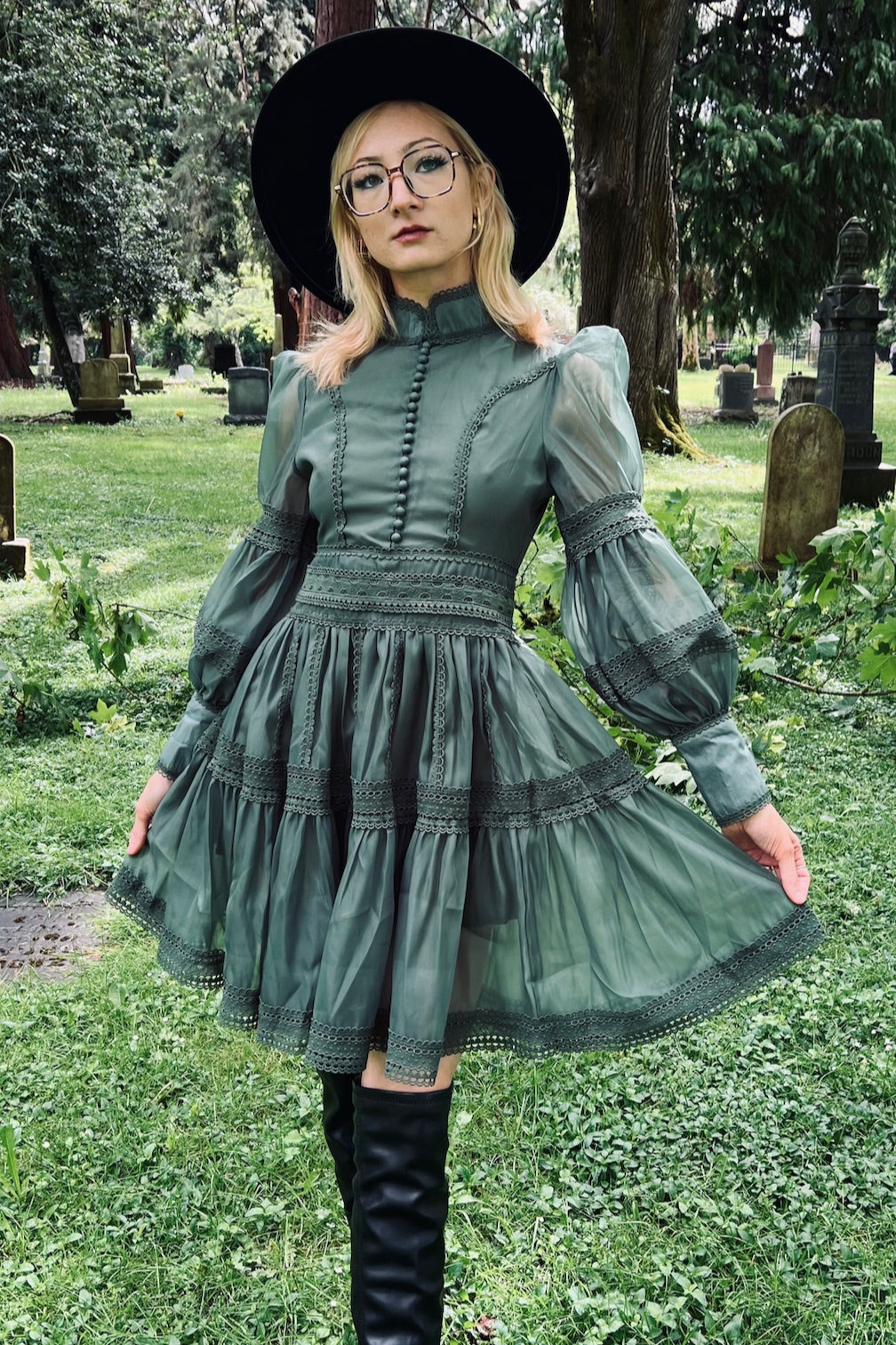Step into the soirée like a shadow-draped debutante in the Morgana Dress — a romantic, Victorian-inspired stunner with the signature Agatha dress charm. With its lace accents, puffed sleeves, and a nipped-in waist, this dress is made for dramatic entrances and whispered secrets. The flouncy skirt swings like a whispered curse, while subtle gothic details keep things perfectly eerie yet elegant. Whether you’re attending a moonlit masquerade or hosting your own haunted tea party, this dress ensures all eyes (living or otherwise) are on you.