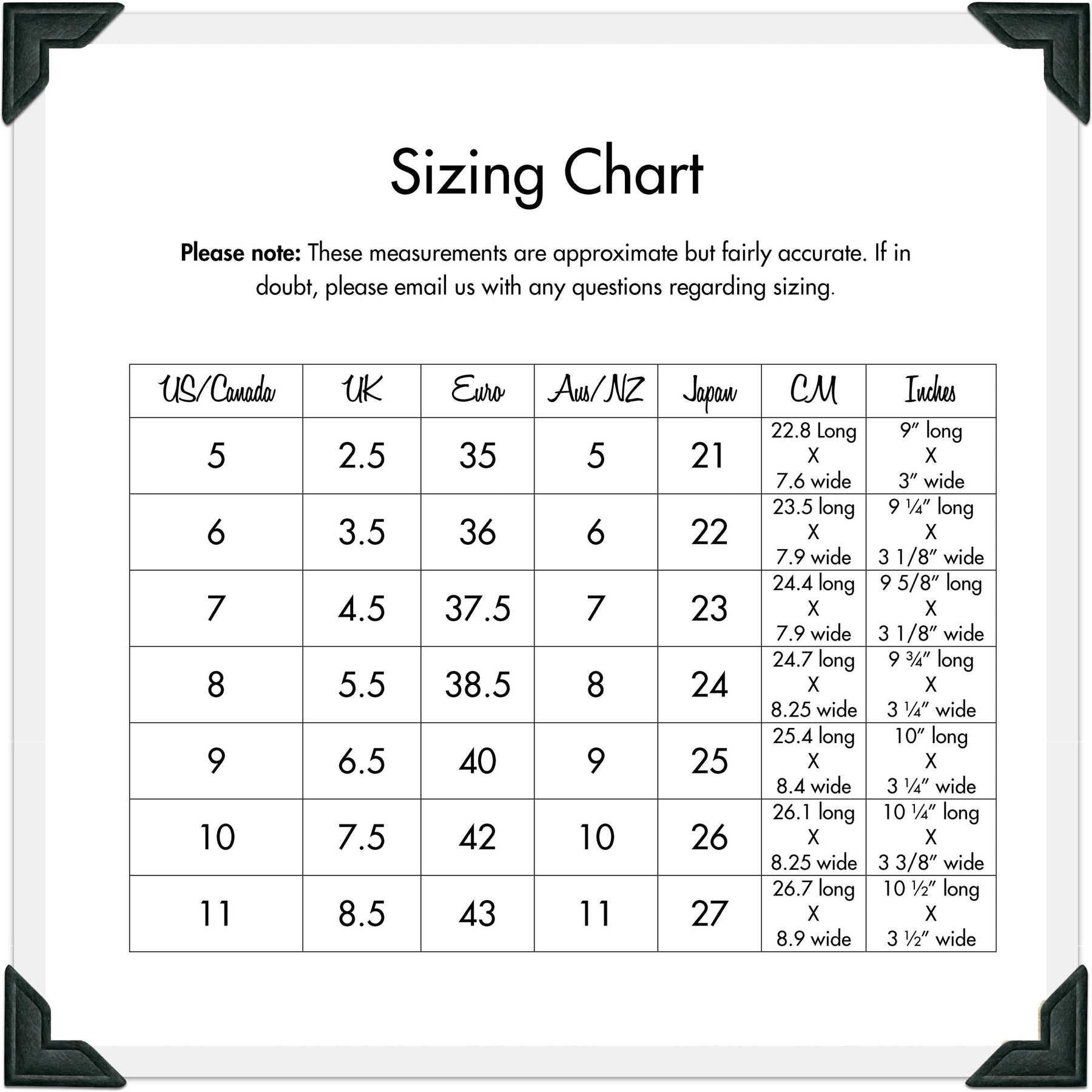 ~This style fits quite true to US sizing in Length. Fits slightly narrow in Width.