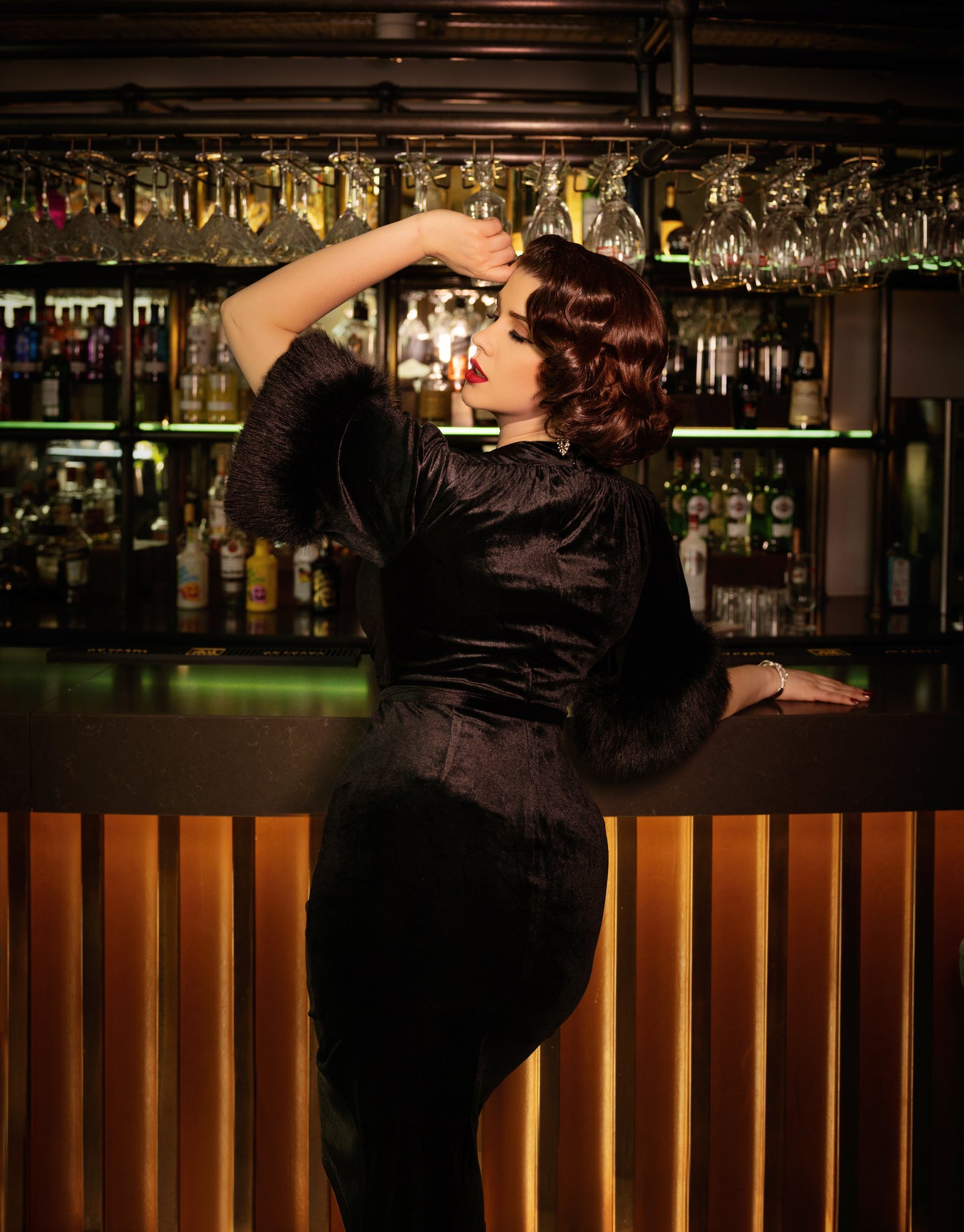 The 5th Avenue Dress in Black (Also available in Lavender) is an exquisite ode to 1940's glamour. Featuring flared sleeves with attached Faux fur, pleated V-neck bust and faux wrap skirt (fixed waistline) with sash belt. All in a curve hugging comfortable stretch velvet. This comfortable statement piece will make you feel as good as you look!