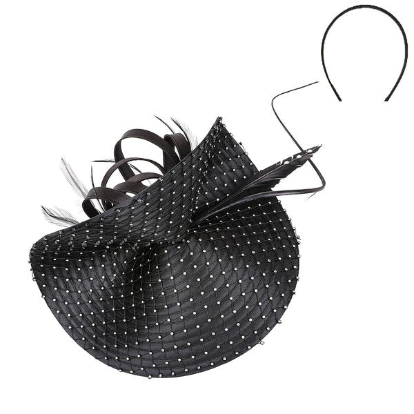 The ElleRebel Feather and Rhinestone Fascinator is a stylish black hat with a netted pattern, curved ribbon accents, sparkling rhinestones, and a thin headband for vintage-inspired glamour.