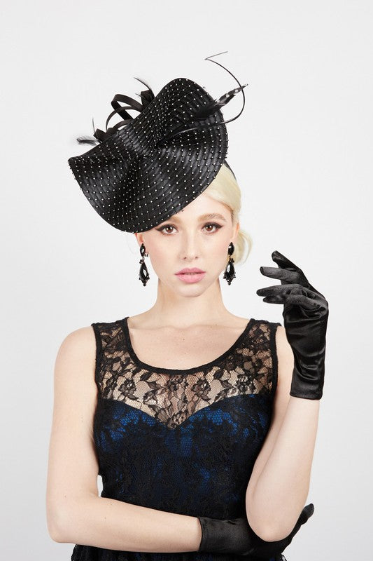 A woman in a black lace dress and black satin gloves showcases vintage glamour, wearing the ElleRebel Feather and Rhinestone Fascinator. Her blonde hair is pulled back as she poses elegantly against a plain white background.