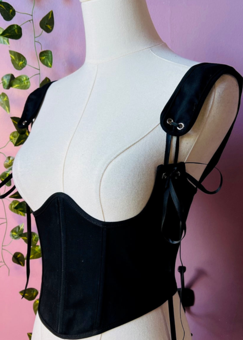 This corset has fully adjustable straps and a lace up back. The structured boning will give you that nipped in waist look. Perfect for layering.