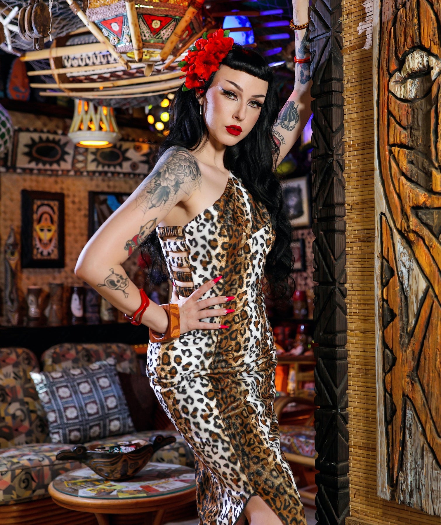 Channel your inner Bettie! This leopard bombshell is a loving nod to the iconic Bettie Page leopard romper moment, reimagined as a curve-hugging 1950s wiggle dress. The asymmetrical one-shoulder neckline and pointed hem brings the drama, while the stretchy side bands add that sexy, cage-detail edge (and extra comfort). Wild Vixen energy guaranteed!