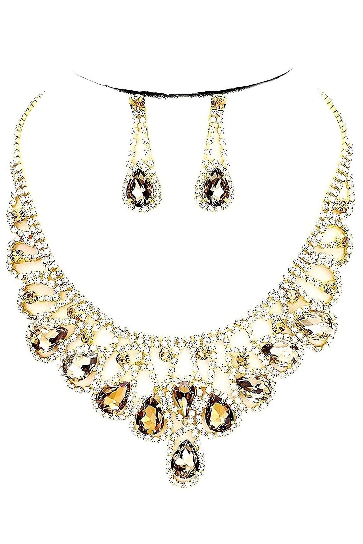 All hail the queen of drama. This rhinestone stunner fans out in swoops and swirls, dotted with juicy pear-cut drops—and comes with matching earrings to finish the romance. ❤️✨