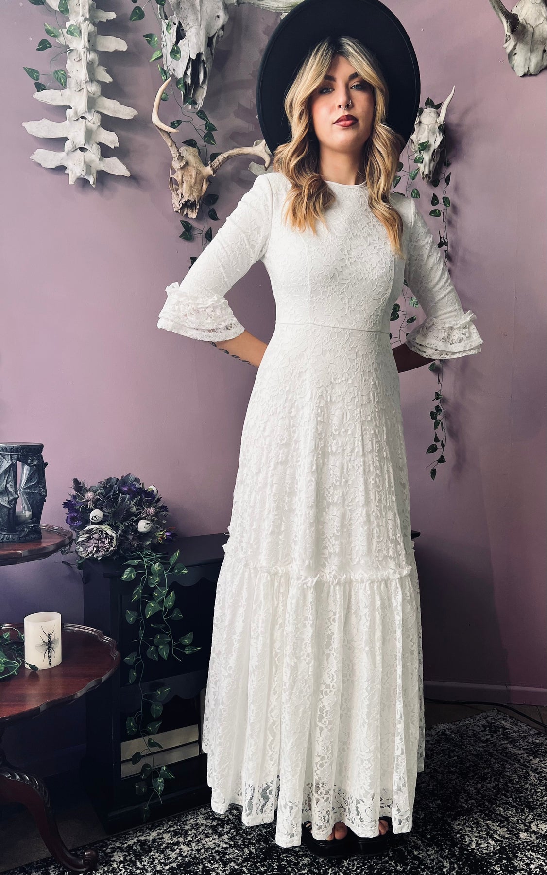 The Mina maxi dress is made of soft ivory floral lace with a fitted waist, full floor length skirt, ruffled elbow cuffs and hem, fully lined and finished with a back zip.
