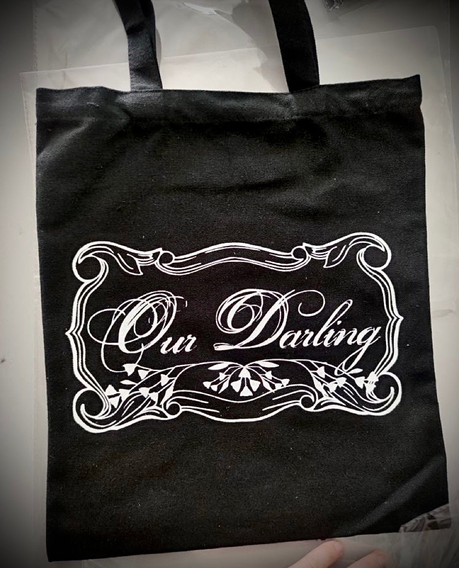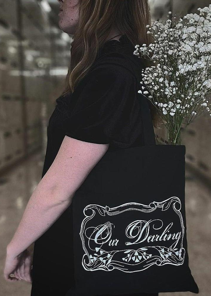 High quality thick cotton black canvas tote bag features a large Our Darling logo on the front