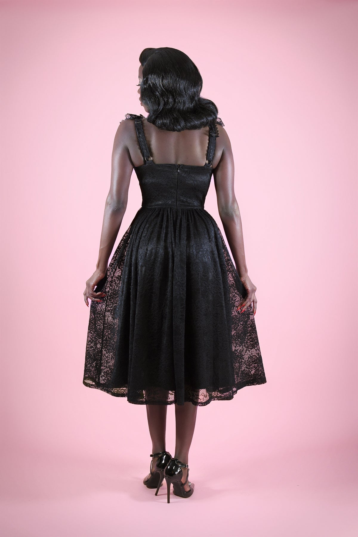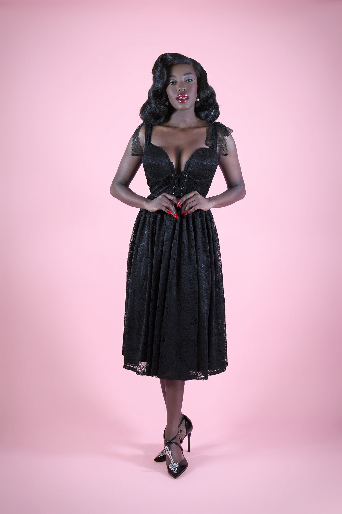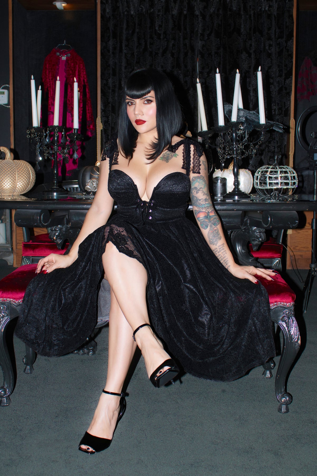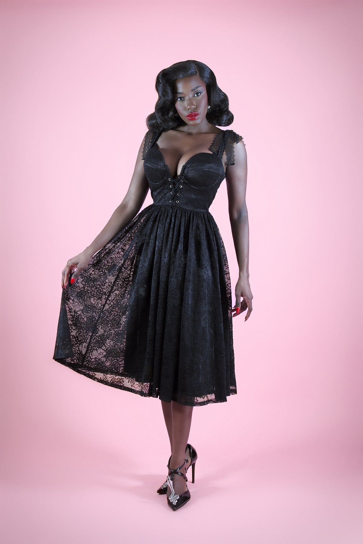 A Dark Romance Draped in Lace, the Penelope Dress—a hauntingly romantic piece designed from a poly elastane blend lace with a soft stretch poly satin lining, this beauty offers just the right amount of comfort and structure, with 2 inches of available fabric stretch to hug your curves perfectly. The bodice features a sultry sweetheart neckline with a lace-up corset front that allows for subtle shaping and adjustable allure. Adjustable lace-trimmed straps tie delicately at the shoulders, adding a hint of vintage softness to this dark dream.