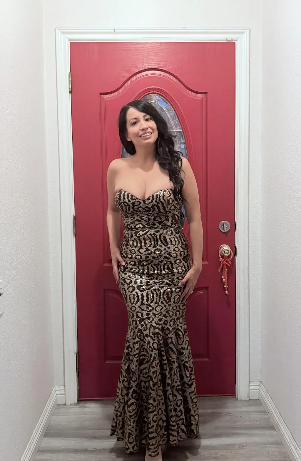 Fabric & Fit: Fit runs small in the bust, fabric is not overly stretchy so we don’t suggest sizing down. If you are between sizes, size up. Length is best suited on 5’3- 5’7 but you can add a mermaid petticoat for more length. Crafted from stretch leopard sequin fabric and fully lined in smooth stretch satin, this gown molds to the body while allowing movement and comfort. Side boning provides structure and support to the strapless bodice, while the fitted shape flares slightly into a mermaid hem for a dramatic finish. Measuring approximately 43 inches from waist to hem, it sweeps to full maxi length for red-carpet-worthy presence. Length is ideal for 5'4 to 5'7 but can also work for other heights, the model is 5'11